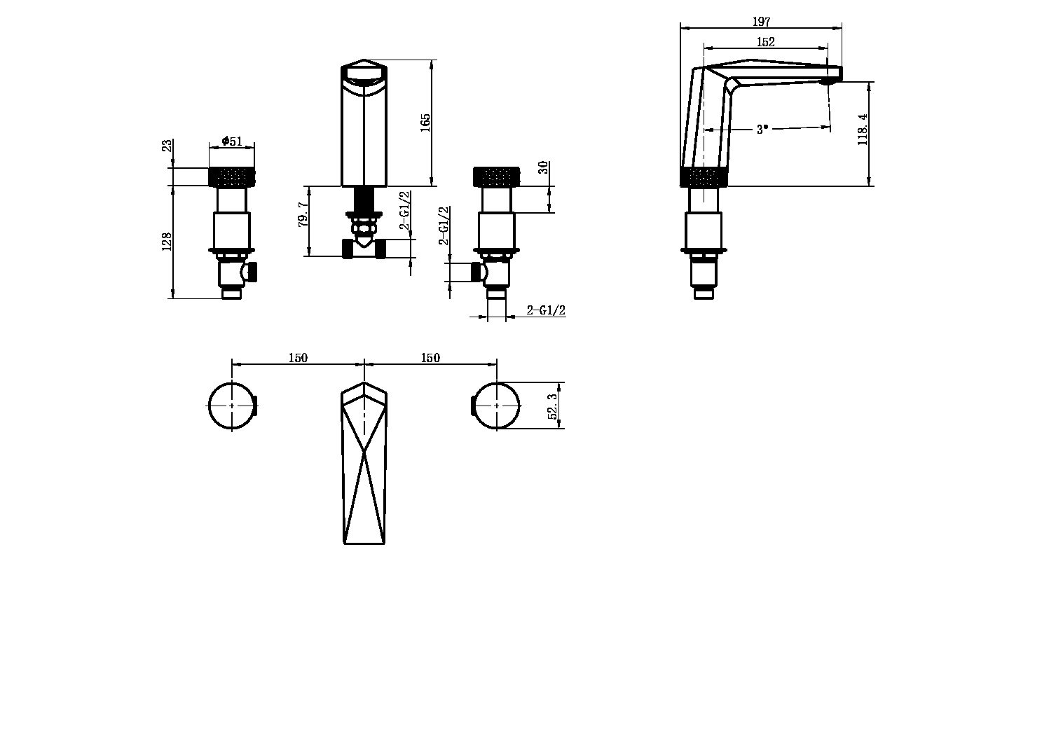Смеситель для раковины BOHEME Venturo 150-GM-DIAMOND на 3отв. ручка DIAMOND Gun Metall