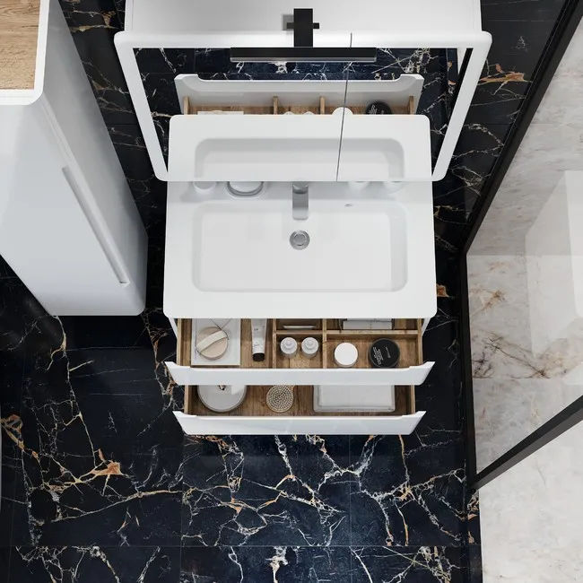 Подвесной монтаж не только экономит пространство, но и придает вашей ванной комнате современный и воздушный вид. Фасад выполнен из МДФ с эмалью, а каркас — из прочного ЛДСП с эмалью, что гарантирует долговечность и легкость в уходе.