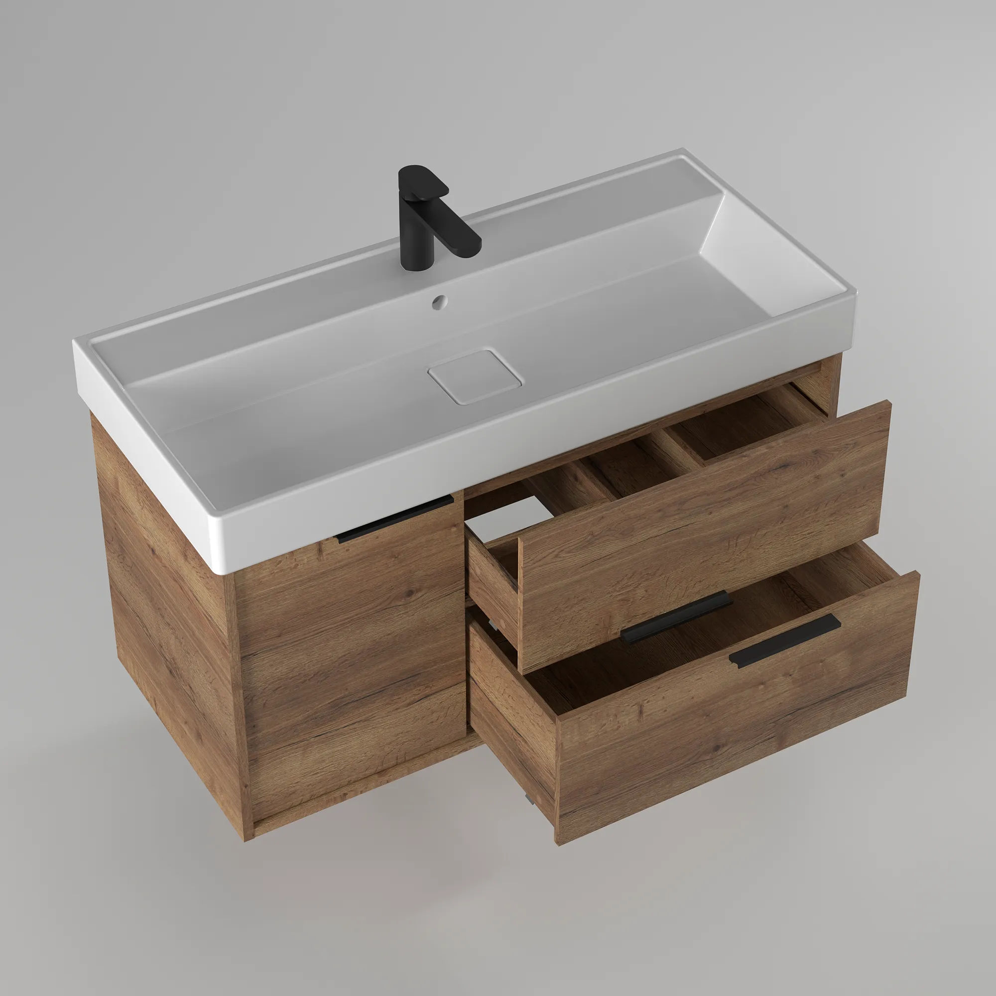 Тумба BRIZ Тесо 100 с раковиной Вилис оснащена двумя выдвижными ящиками и распашной дверцей, что позволяет удобно организовать пространство для хранения ваших вещей. Фасад и каркас выполнены из влагостойкого ЛДСП с эмалевым покрытием, гарантируя долговечность и защиту от влаги.