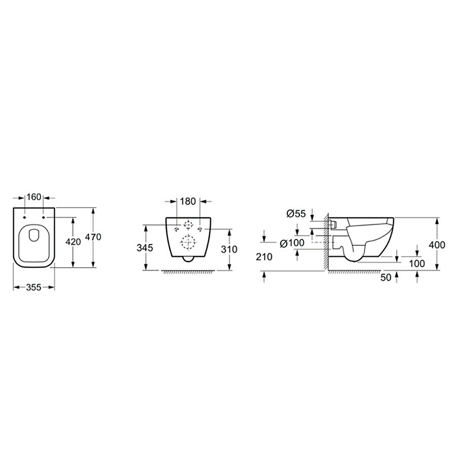 В комплектацию поставки входят: чаша унитаза, быстросъемное дюропластовое сиденье с медленно опускающейся крышкой и хромированными металлическими петлями, комплект крепления для подвесного монтажа, декоративные колпачки.