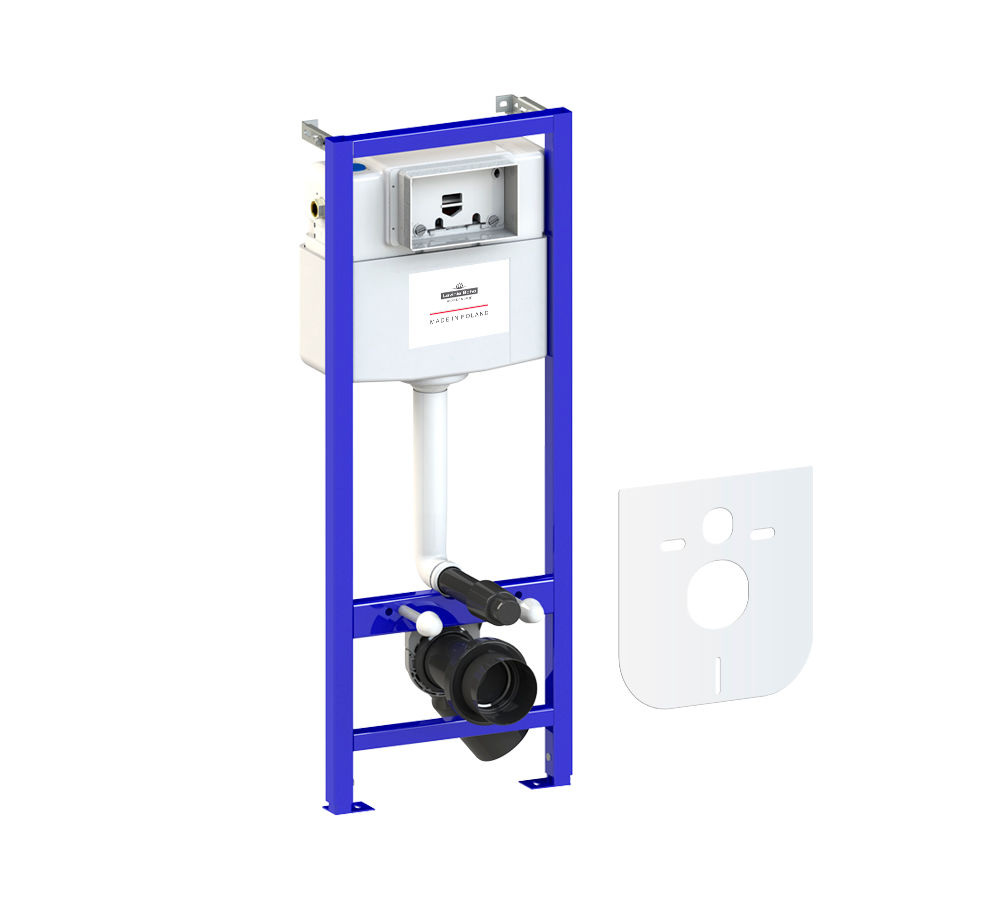 В стандартную комплектацию поставки входят: самонесущая стальная рама, окрашенная методом порошкового напыления; смывной бачок скрытого монтажа, изолированный от конденсационной влаги, с фронтальным управлением, впускным и смывным гарнитуром и ревизионным окошком; укорачиваемый шаблон для отделки отверстия под клавишу смыва; соединительное колено для унитаза DN90 из PE c переходной муфтой DN90/110 из РE и регулировкой 4/22/40 мм; комплект крепежных элементов для установки инсталляции; комплект крепежных элементов для установки унитаза; комплект патрубков с резиновыми манжетами для подсоединения унитаза; звукоизолирующая прокладка для унитаза; выдвижные опоры с лапками; универсальный комплект креплений к стене с возможностью «прямого» или «углового» монтажа (диапазон регулирования по глубине от передней кромки элемента 155 – 235 мм).