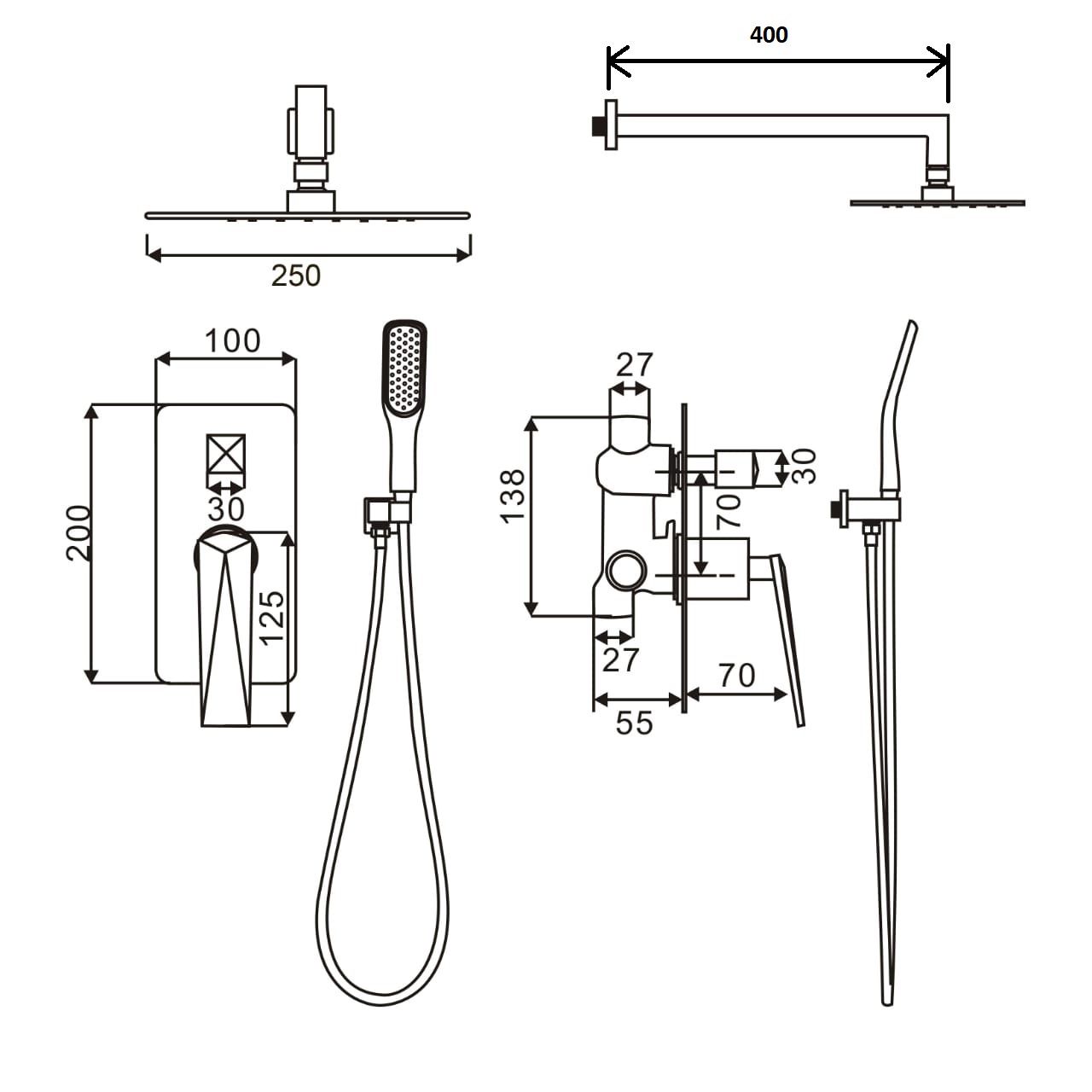 В систему для душа скрытого монтажа входит: смеситель, верхний душ, ручной душ.