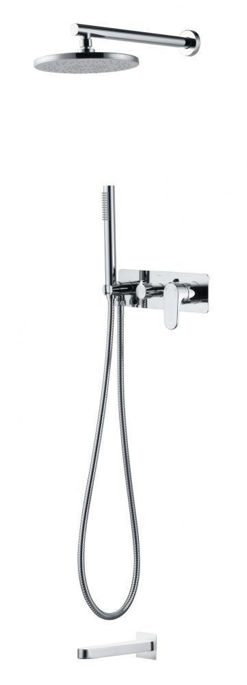 В систему для душа скрытого монтажа входит: смеситель, верхний душ, ручной душ, излив.