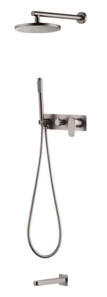 В систему для душа скрытого монтажа входит: смеситель, верхний душ, ручной душ, излив.