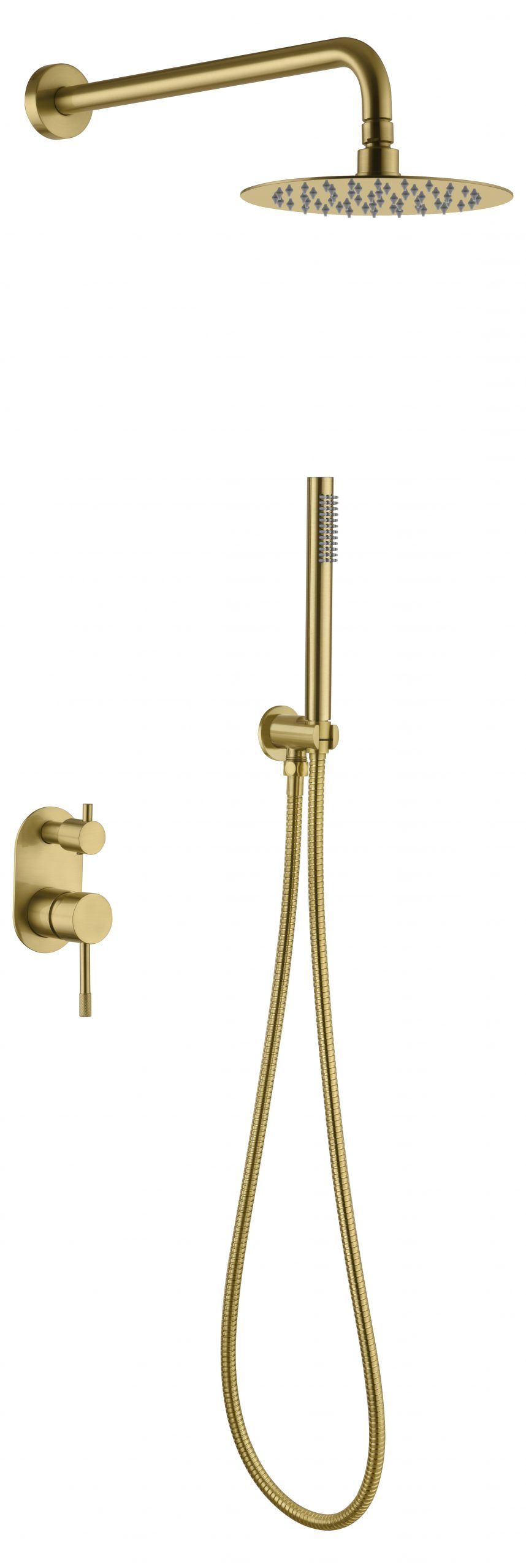 В систему для душа скрытого монтажа входит: смеситель, верхний душ 30 см, ручной душ.