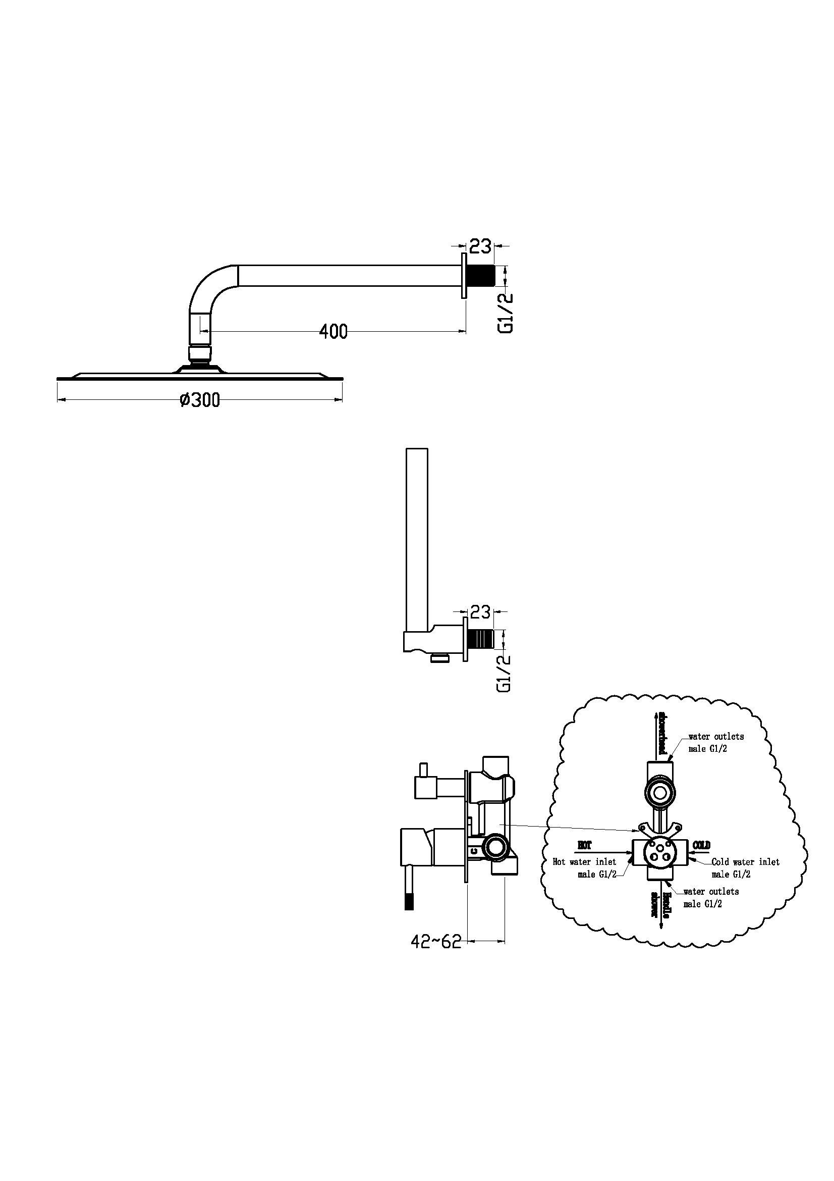 В систему для душа скрытого монтажа входит: смеситель, верхний душ 30 см, ручной душ.