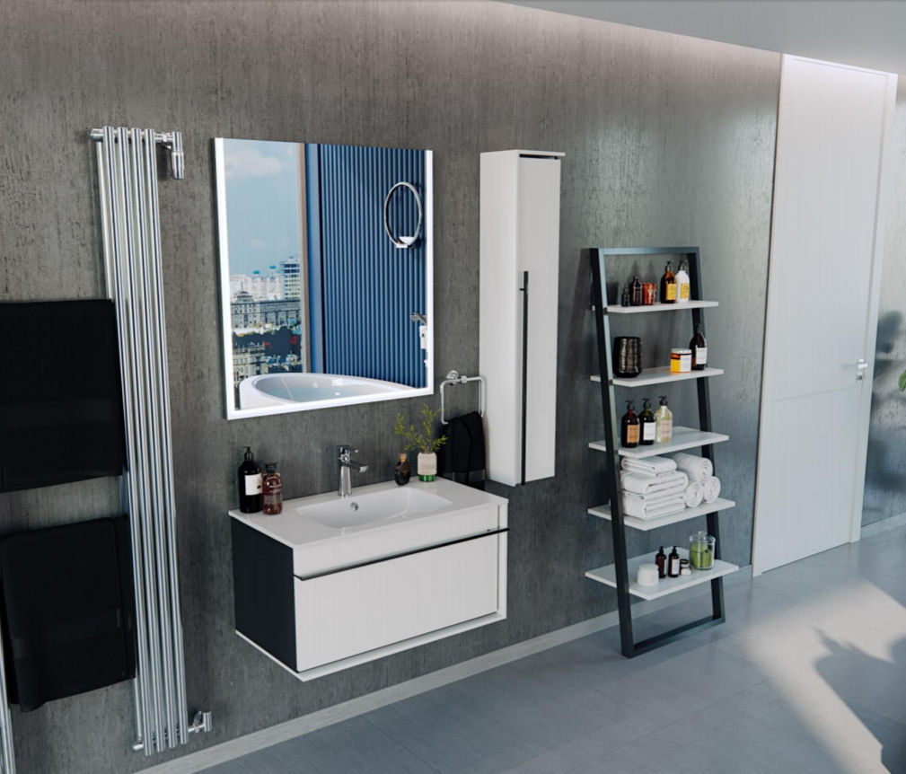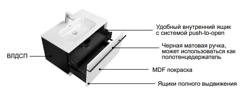 Внутри вас ждет продуманное пространство для хранения: небольшой внутренний ящик с системой push-to-open идеально подходит для аккуратного размещения мелких аксессуаров, а вместительный внешний ящик позволит удобно хранить более крупные предметы. Тонкая изящная ручка в черном матовом цвете не только подчеркивает графичность дизайна, но и служит удобным полотенцедержателем.
