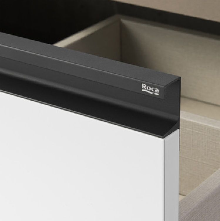 Преобразите вашу ванную комнату с тумбой под раковину Roca Domi 80 см — идеальным сочетанием современного дизайна и продуманной функциональности. Модель Roca Domi 80 см оснащена стильной черной матовой металлической ручкой, которая тянется во всю ширину фасада и оснащена направляющими с мягким закрыванием soft-close для плавной и бесшумной работы.