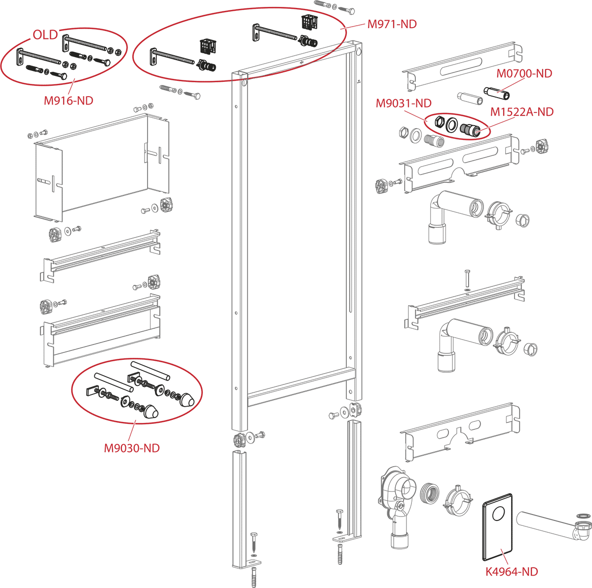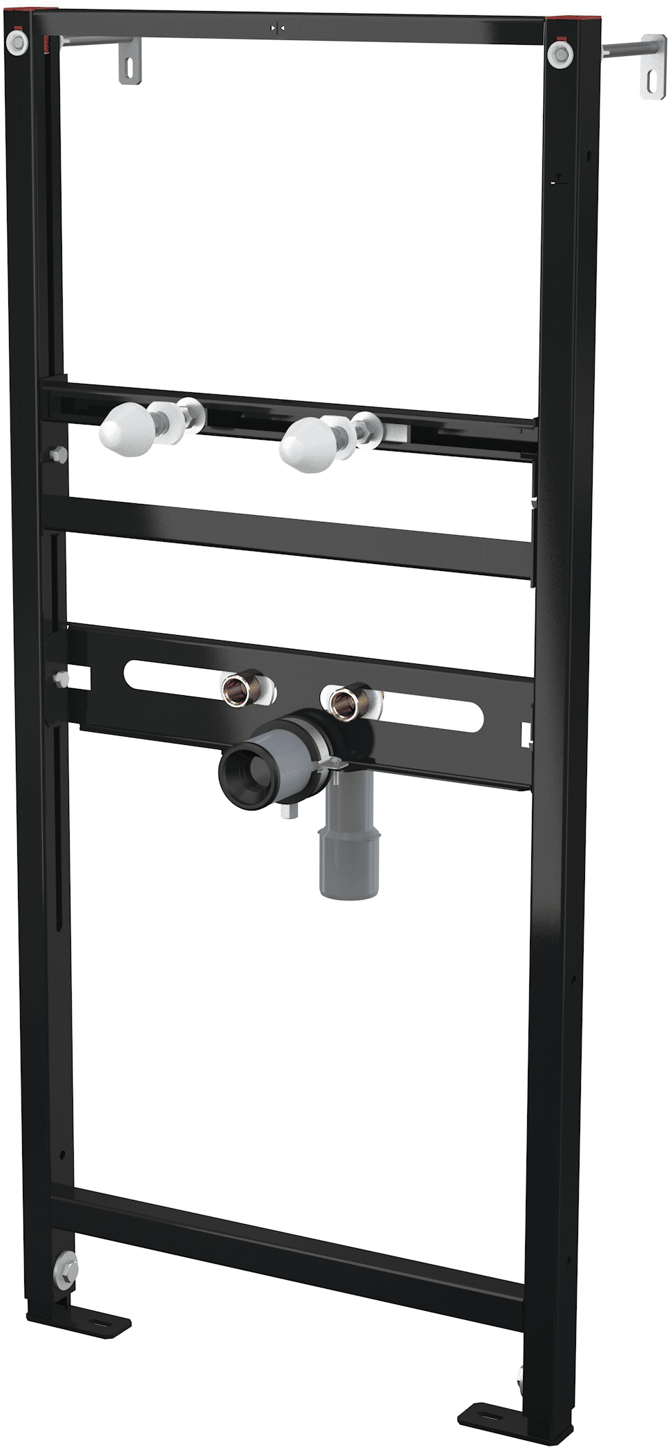В комплекте: рама, монтажный комплект (винт Ø8×60 – 4 шт., дюбель Ø12 – 4 шт.), монтажный комплект для крепления раковин (винт М10×100 – 2 шт.), колпаки для закрытия гаек, резьбовое соединение для подключения воды (G1/2"–G1/2").