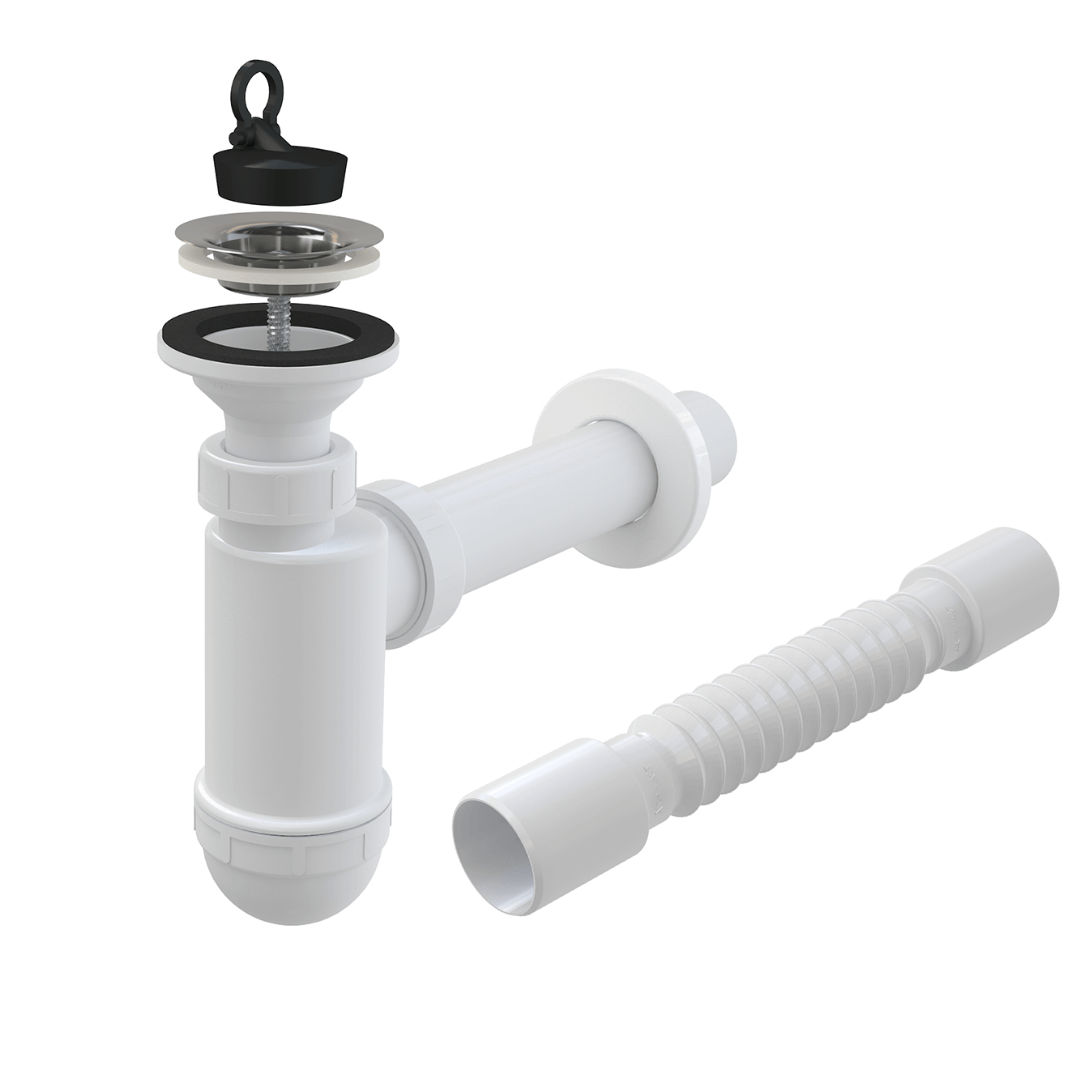 Сифон для раковины AlcaDrain (AlcaPlast) A41+A710-BL-01 предназначен для умывальников и соединения сливных систем с внутренней канализацией. Сифон сделан из полипропилена и подключается к канализационной трубе 40 мм. Гибкое соединение сделанои из полипропилена и имеет регулируемую длину 340–780 мм.