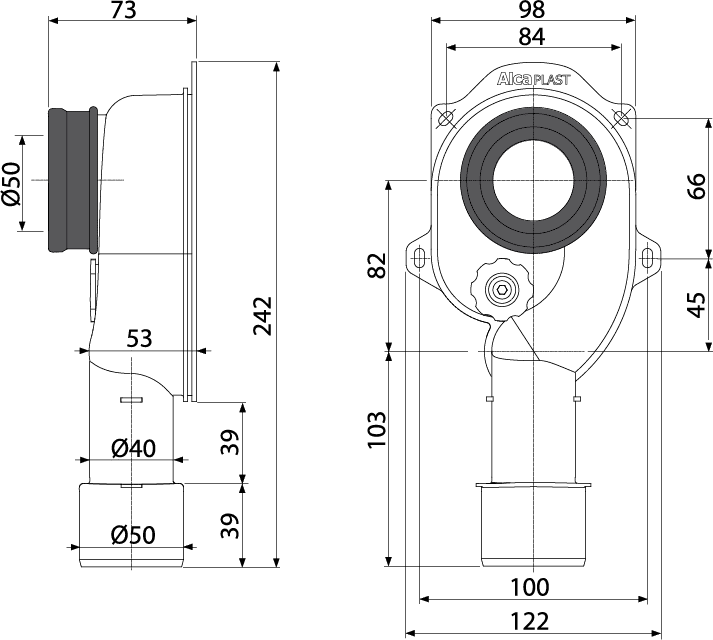 Сифон для писсуара AlcaDrain (AlcaPlast) A45C пренданзначен для писсуара с горизонтальным сливом сзади и для скрытого монтажа в стену.