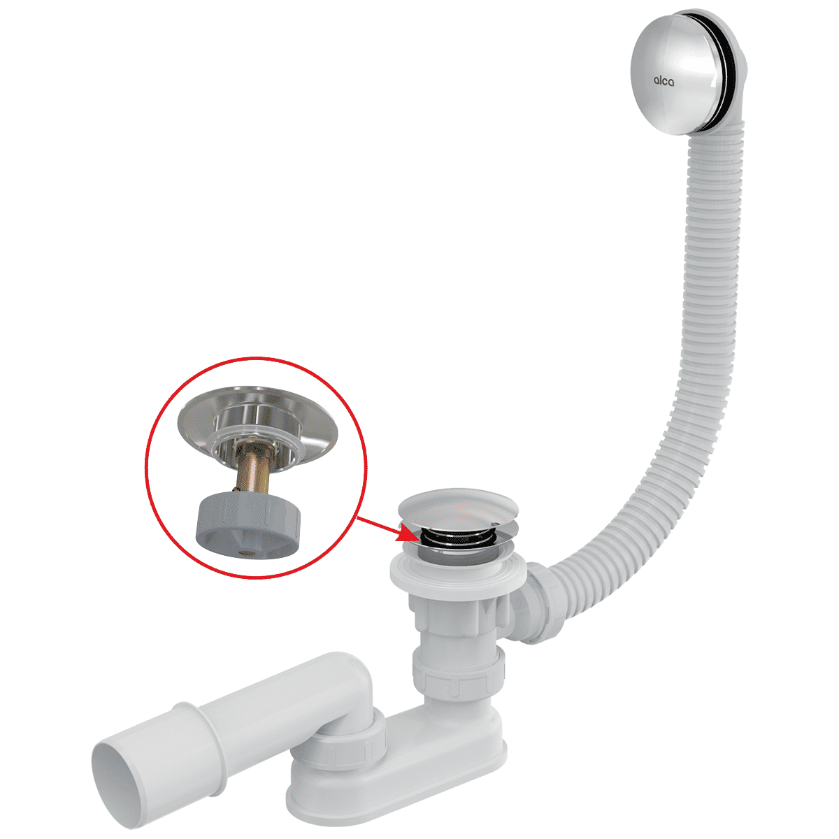 Сифон для ванны AlcaDrain (AlcaPlast) A504CKM-80 click/clack металл предназначен для слива воды из ванны в канализационный сток. Подходит для ванн стандартных размеров и для ванн со стоковым отверстием 52 мм.