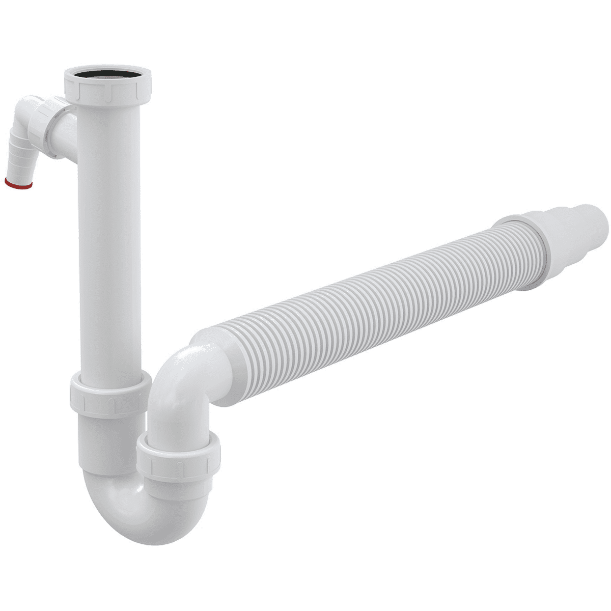 В комплекте: корпус сифона со штуцером, гофрированный гибкий шланг, резьбовое соединение 6/4" для подключения слива мойки или раковины.