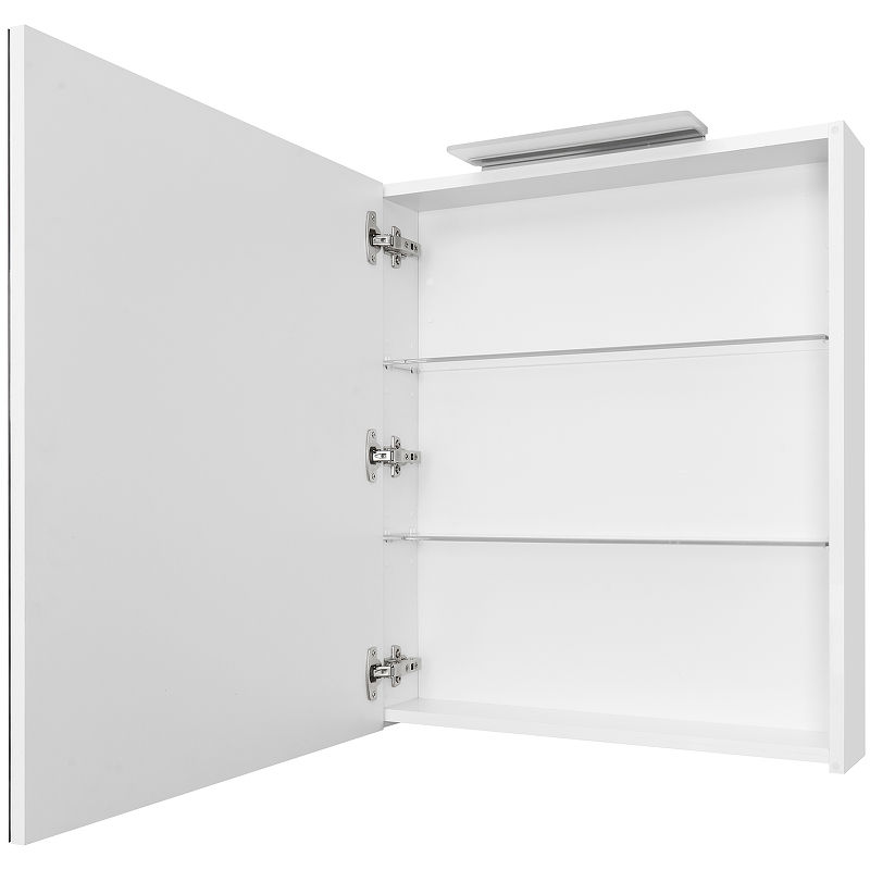 Корпус шкафа выполнен из влагостойкого ЛДСП, что обеспечивает надежность и долговечность даже в условиях повышенной влажности. За зеркальной дверцей скрываются две стеклянные полки — удобное пространство для аккуратного размещения косметики и средств гигиены.