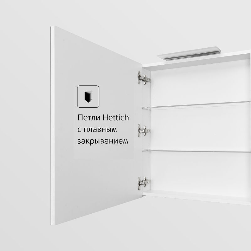 Петли с встроенным доводчиком обеспечивают плавное и бесшумное закрывание дверцы, добавляя комфорта в повседневное использование. Яркая LED-подсветка мощностью 6 Вт создает приятное и равномерное освещение, делая каждое утро в ванной комфортным и стильным.