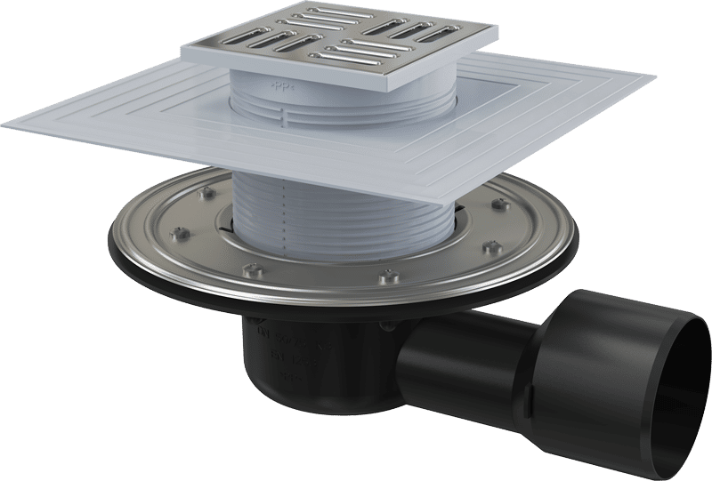 Душевой трап AlcaDrain (AlcaPlast) APV3344 105×105/50/75 мм боковой сток решетка из нержавеющей стали фланец из нержавеющей стали воротник изоляции 2–го уровня гидрозатвор сухой и мокрый