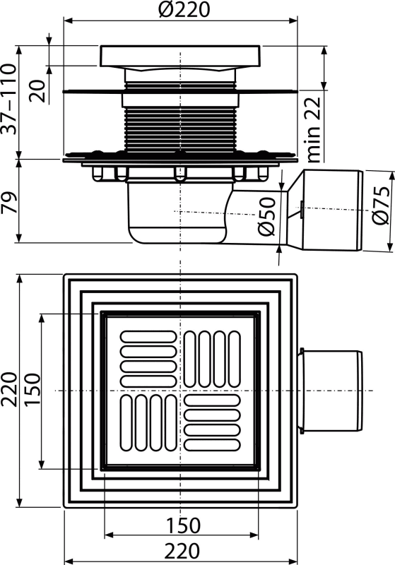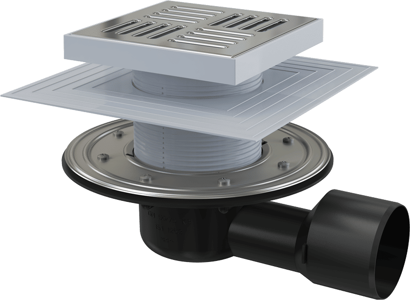 Душевой трап AlcaDrain (AlcaPlast) APV3444 150×150/50/75 мм боковой сток решетка из нержавеющей стали фланец из нержавеющей стали воротник изоляции 2–го уровня гидрозатвор сухой и мокрый