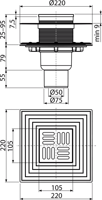 Душевой трап AlcaDrain (AlcaPlast) APV4344 105×105/50/75 мм прямой сток решетка из нержавеющей стали фланец из нержавеющей стали воротник изоляции 2–го уровня гидрозатвор сухой и мокрый