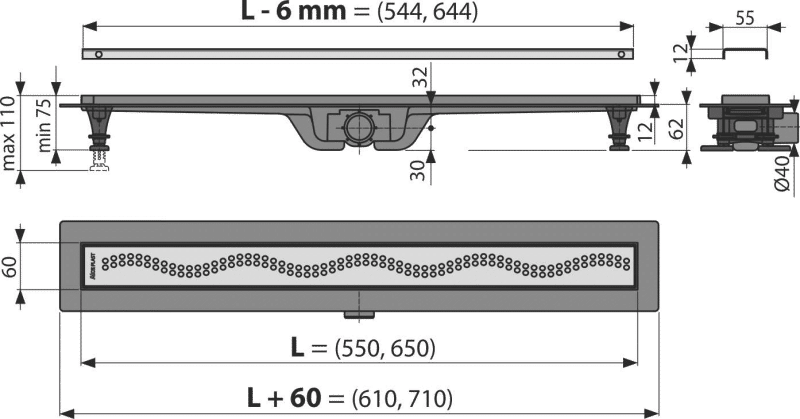 Душевой лоток AlcaDrain (AlcaPlast) APZ8-650M с перфорированной решеткой — идеальное решение для водоотведения в душевых на уровне пола. Этот лоток предназначен для использования внутри помещений и может быть установлен как в пространстве, так и непосредственно у стены, обеспечивая безбарьерный доступ.