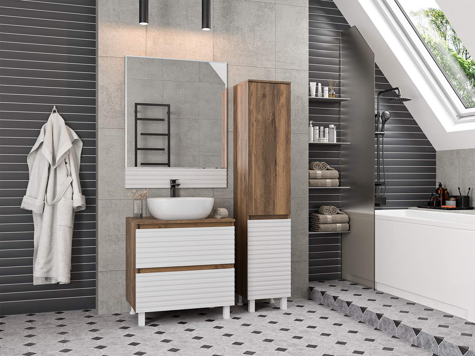 Стильная мебель в ванную Dakota от бренда Brevita сочетает в себе оригинальный внешний вид фрезерованных фасадов и практичную конструкцию с высоким качеством сборки. Высокое качество сборки, практичность, функциональность и эффектный внешний вид сделают эту мебель оригинальным дизайнерским решением для современной ванной комнаты.