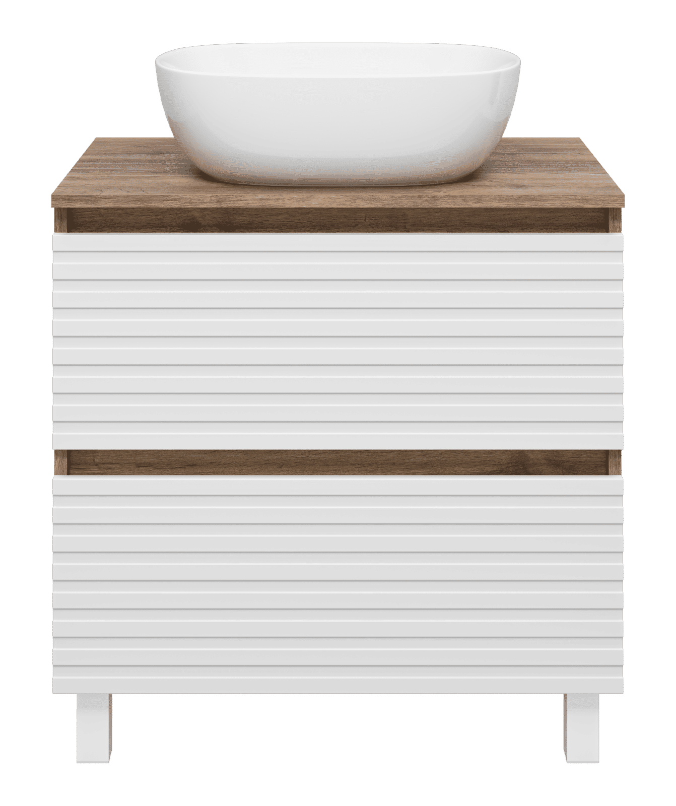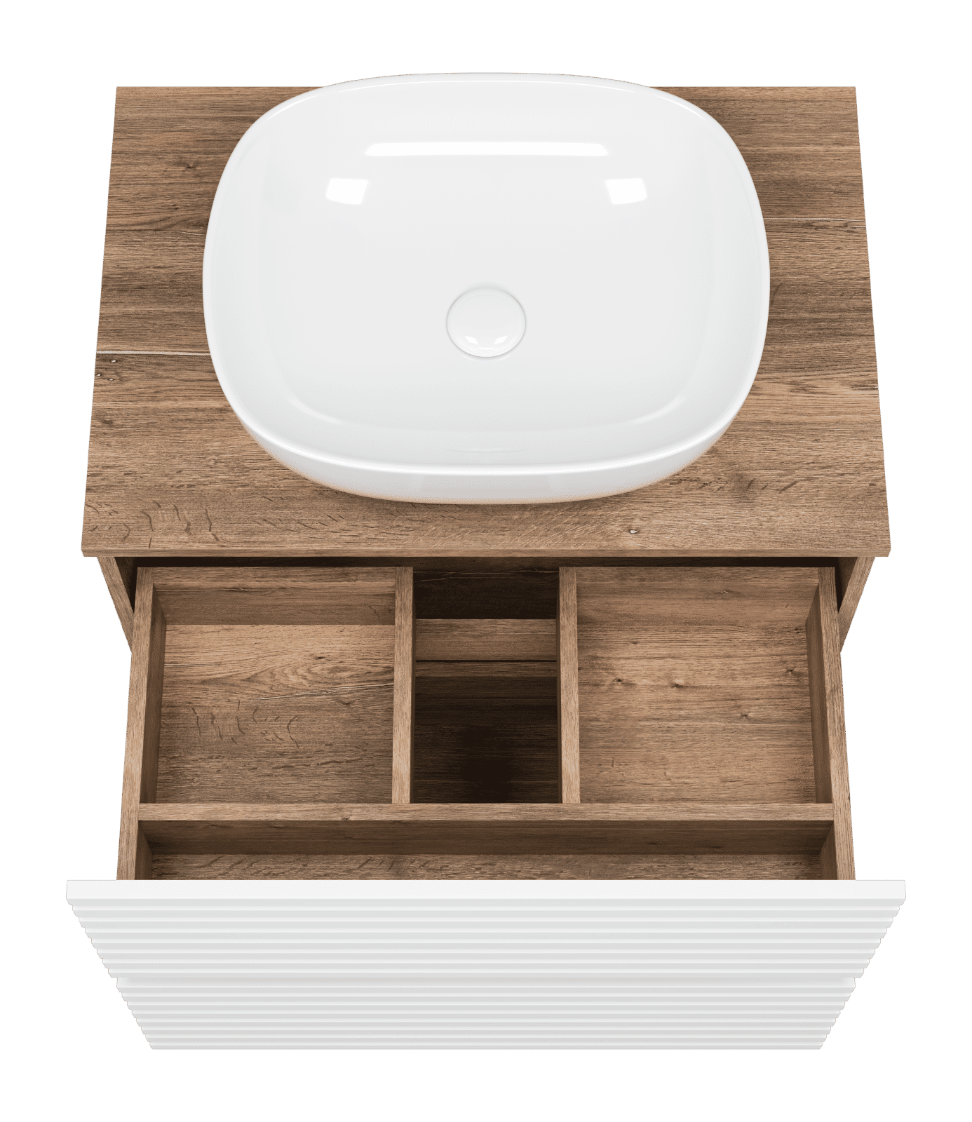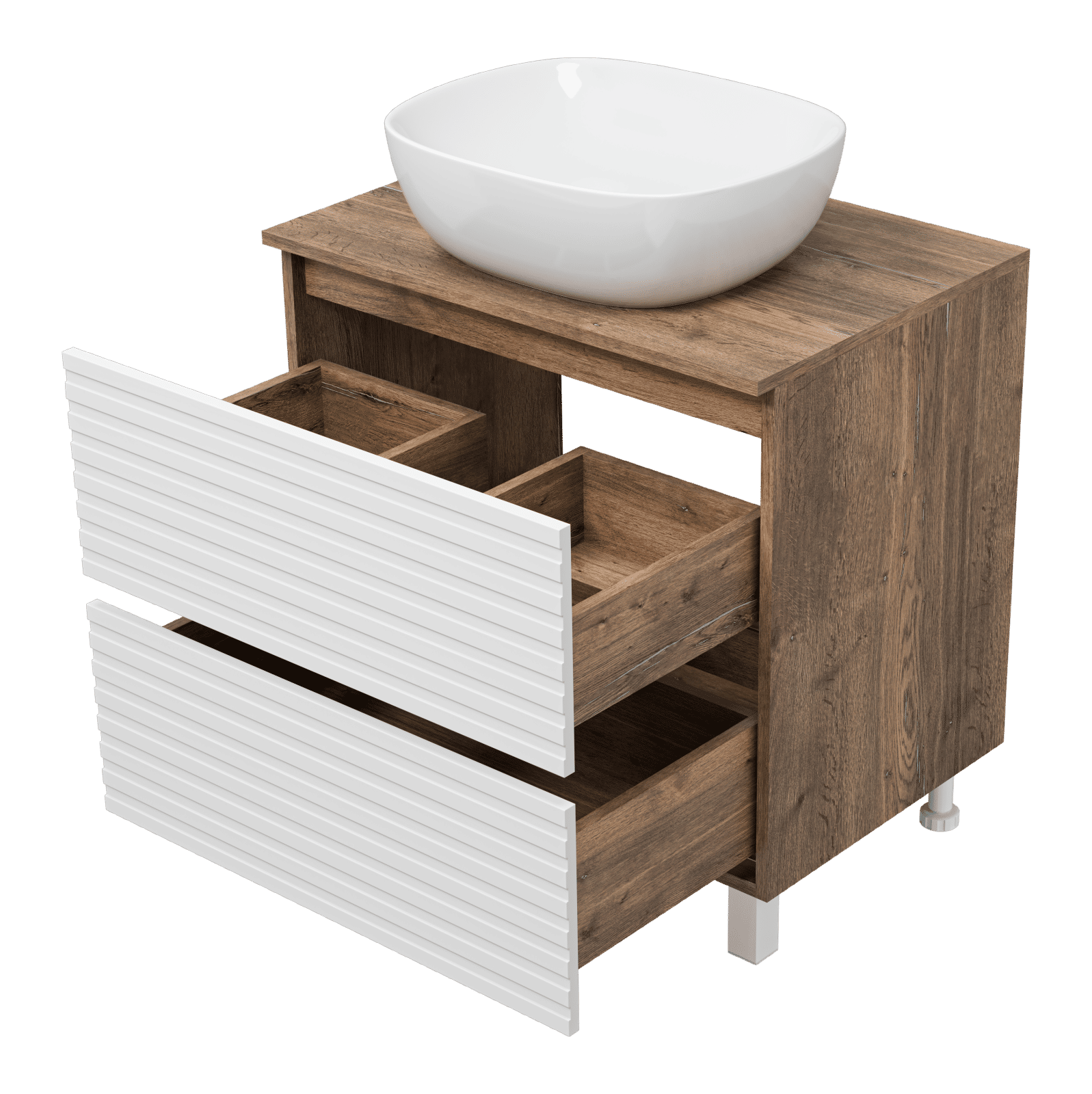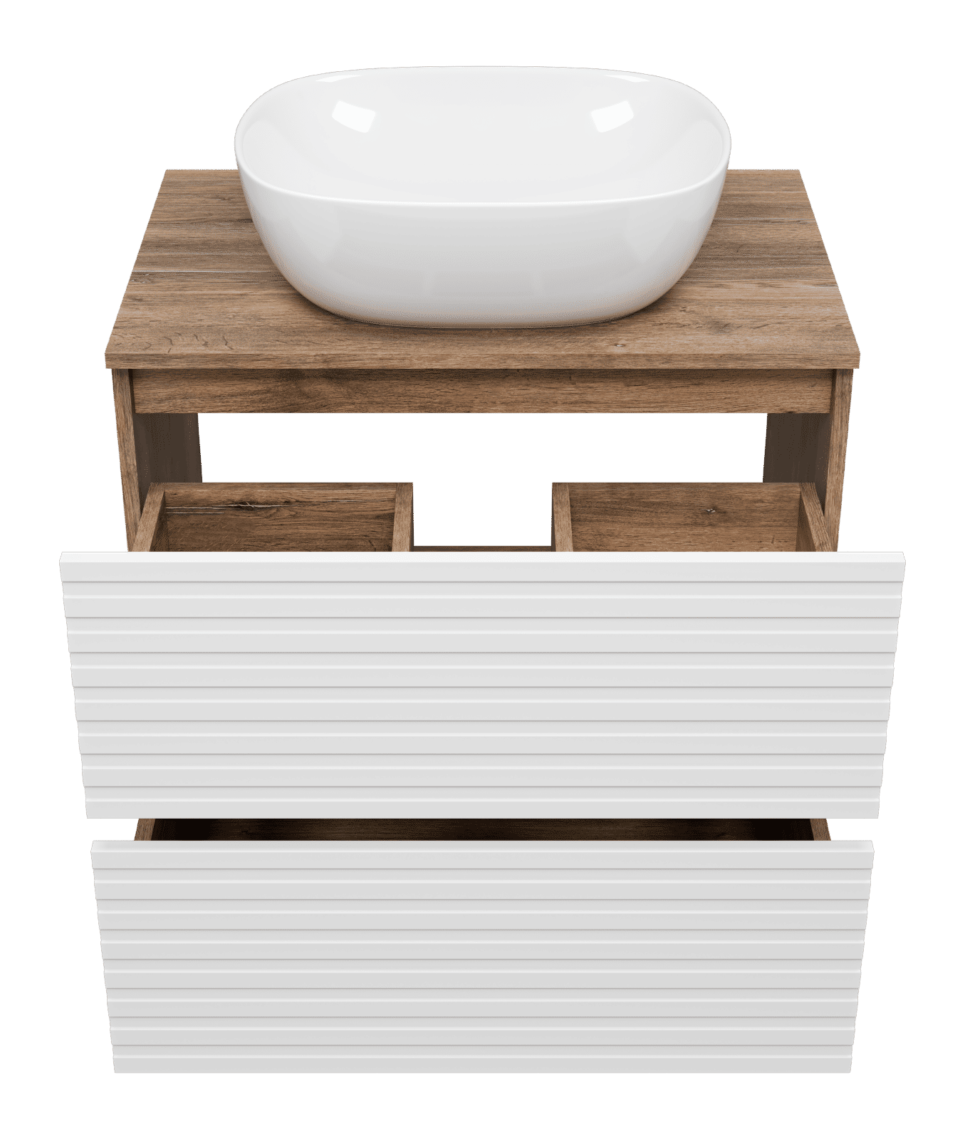 Тумба оснащена двумя выдвижными ящиками, которые установлены на направляющих скрытого монтажа с доводчиками. Верхний ящик разделен на несколько отсеков перегородками. Тумба поставляется с цельной столешницей без отверстий, что позволяет выбрать удобное расположение накладной раковины.
