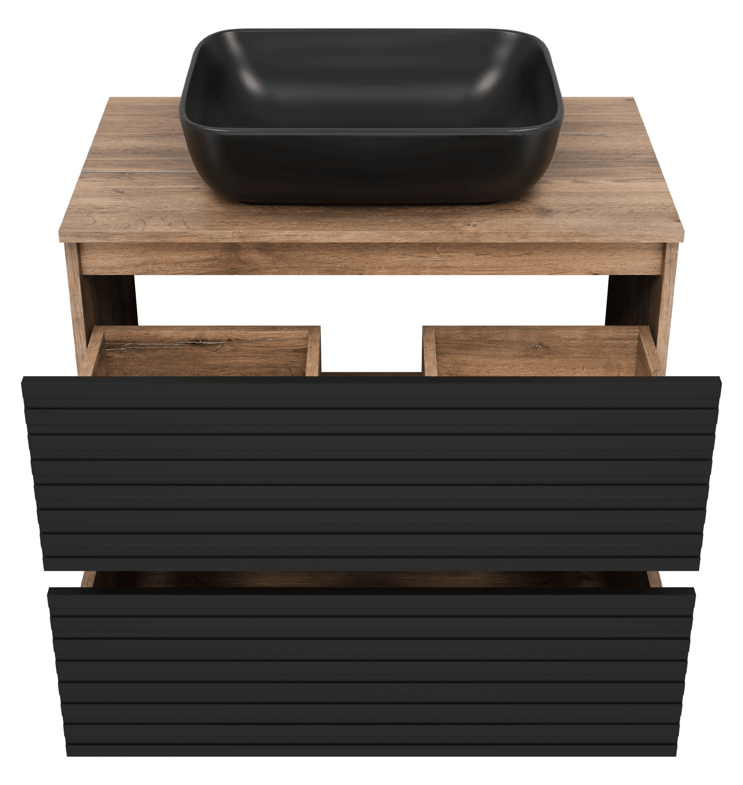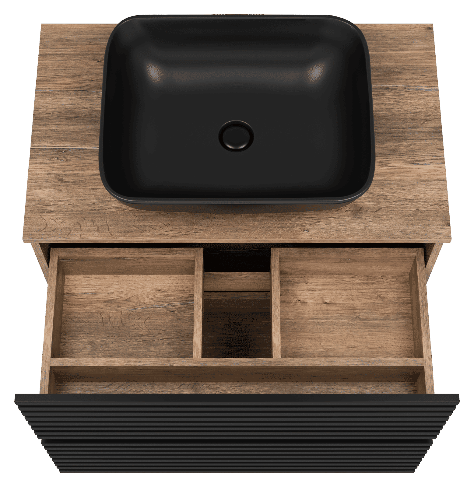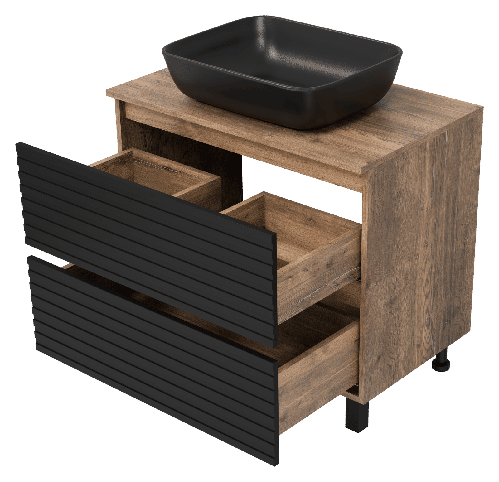 Тумба оснащена двумя выдвижными ящиками, которые установлены на направляющих скрытого монтажа с доводчиками. Верхний ящик разделен на несколько отсеков перегородками. Тумба поставляется с цельной столешницей без отверстий, что позволяет выбрать удобное расположение накладной раковины.