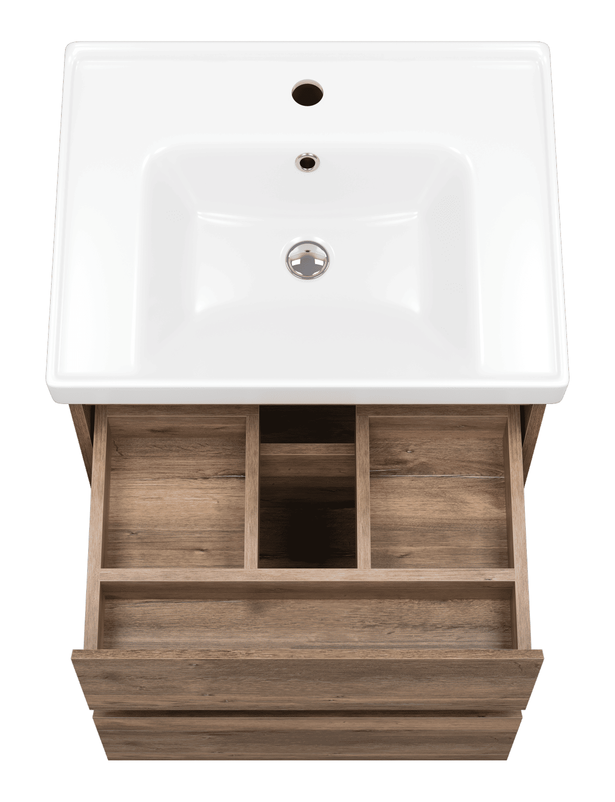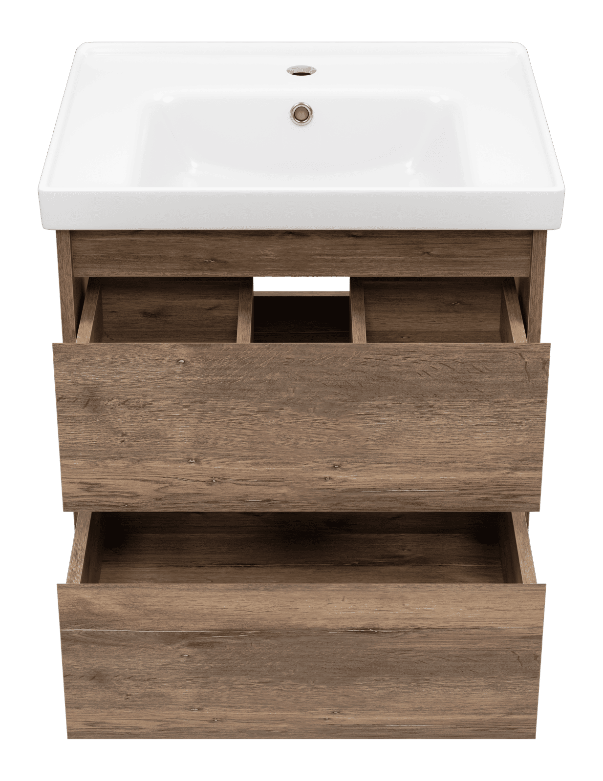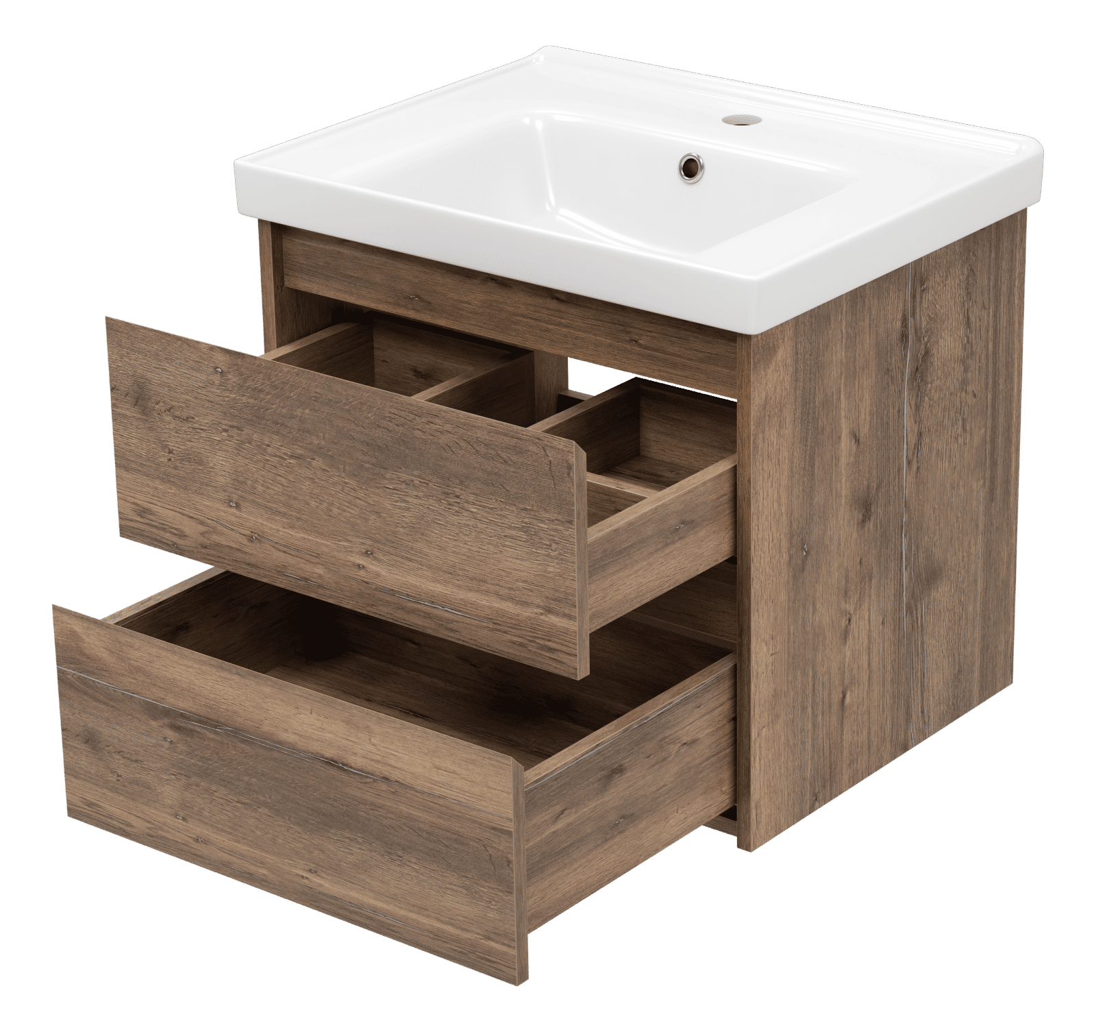 Тумба оснащена двумя выдвижными ящиками с доводчиками, где верхний ящик разделен на несколько отсеков, для удобного и компактного хранения ванных принадлежностей.
