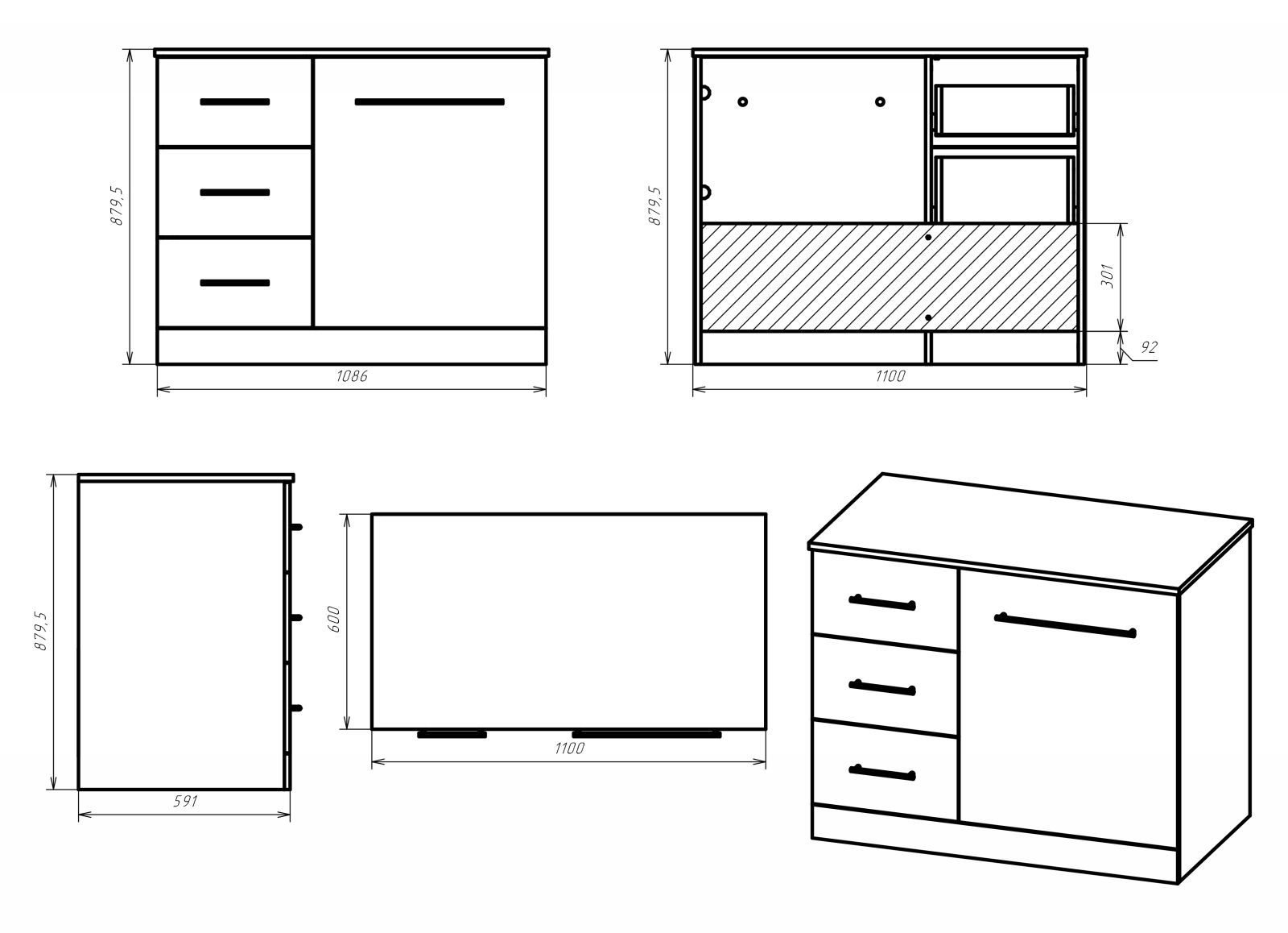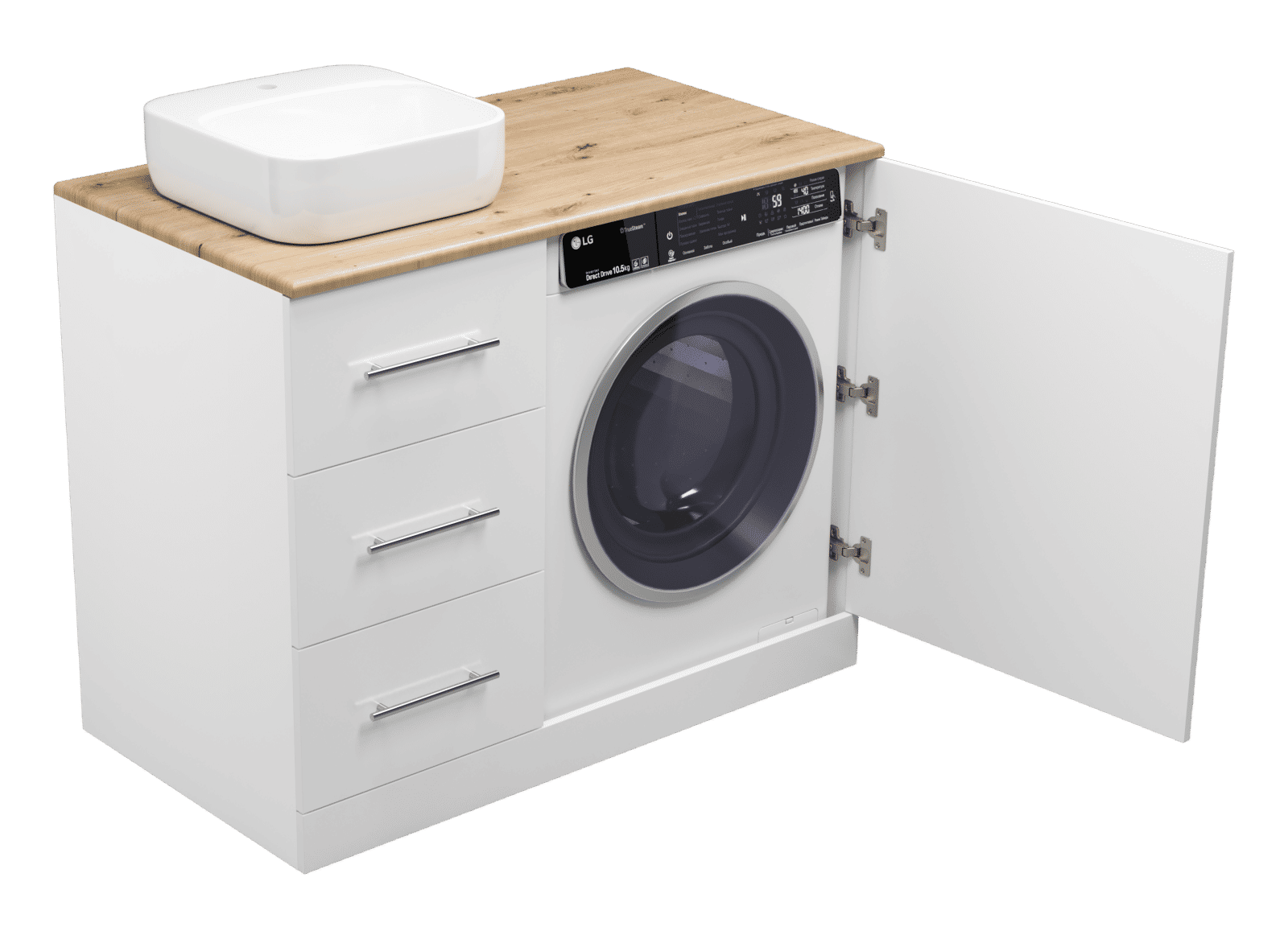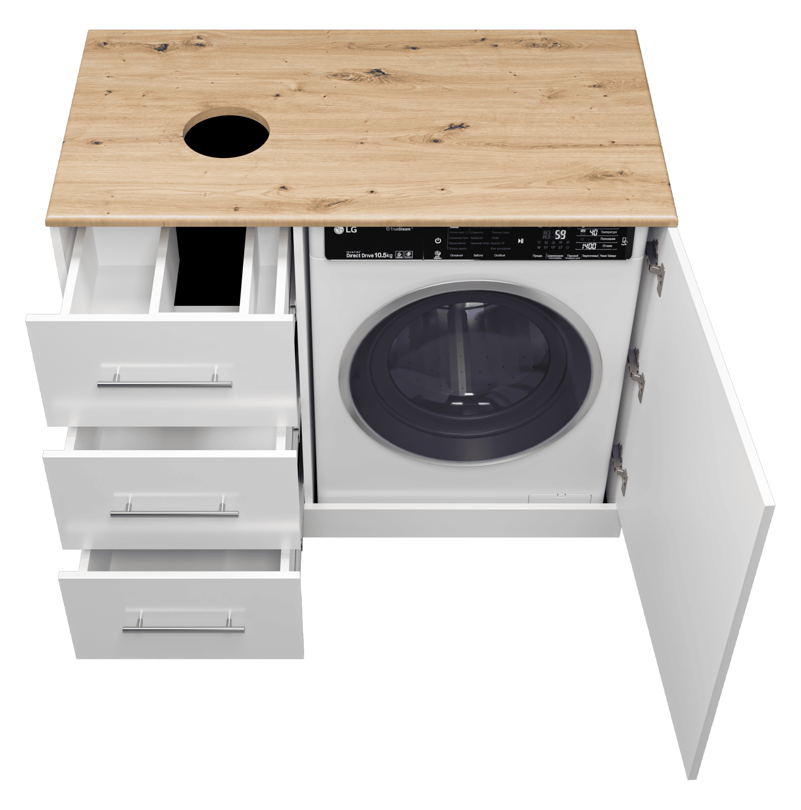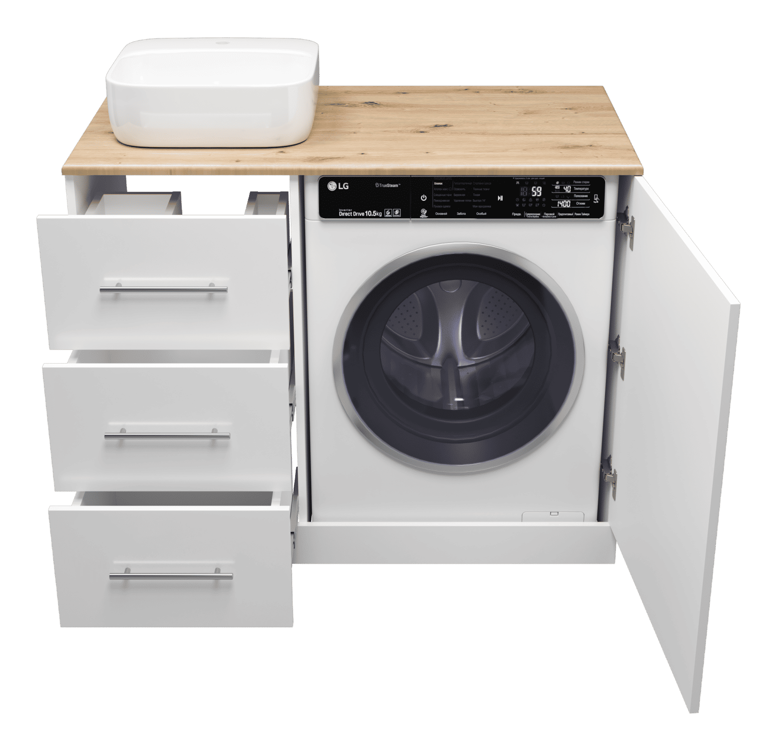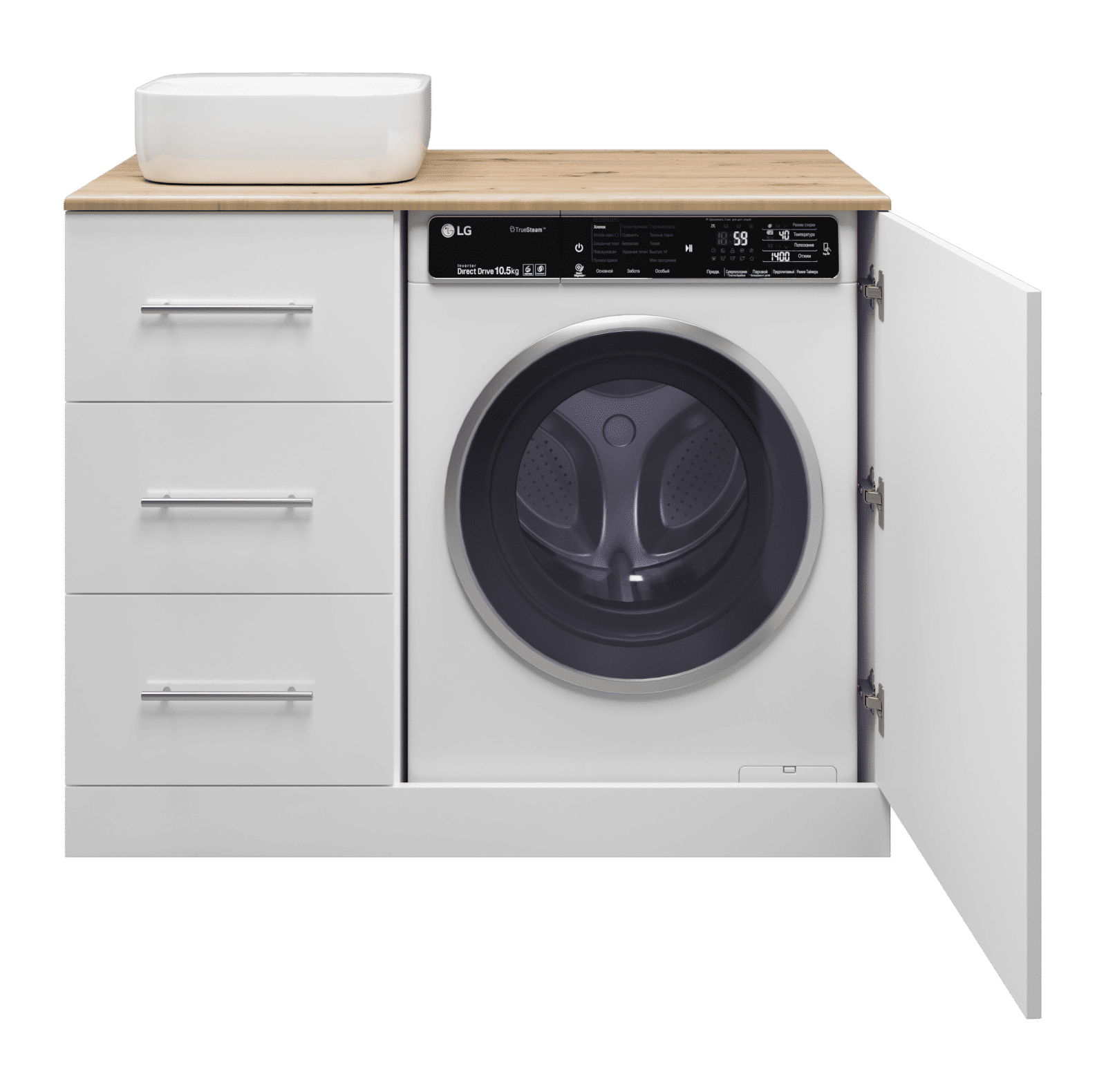 Конструкция тумбы включает в себя три выдвижных ящика и большое отделение, которое поможет спрятать стиральную машину, чтобы не нарушать дизайн ванной комнаты. Отделение для стиральной машины закрывается распашным фасадом. На столешницу можно установить любую накладную раковину на свой вкус.