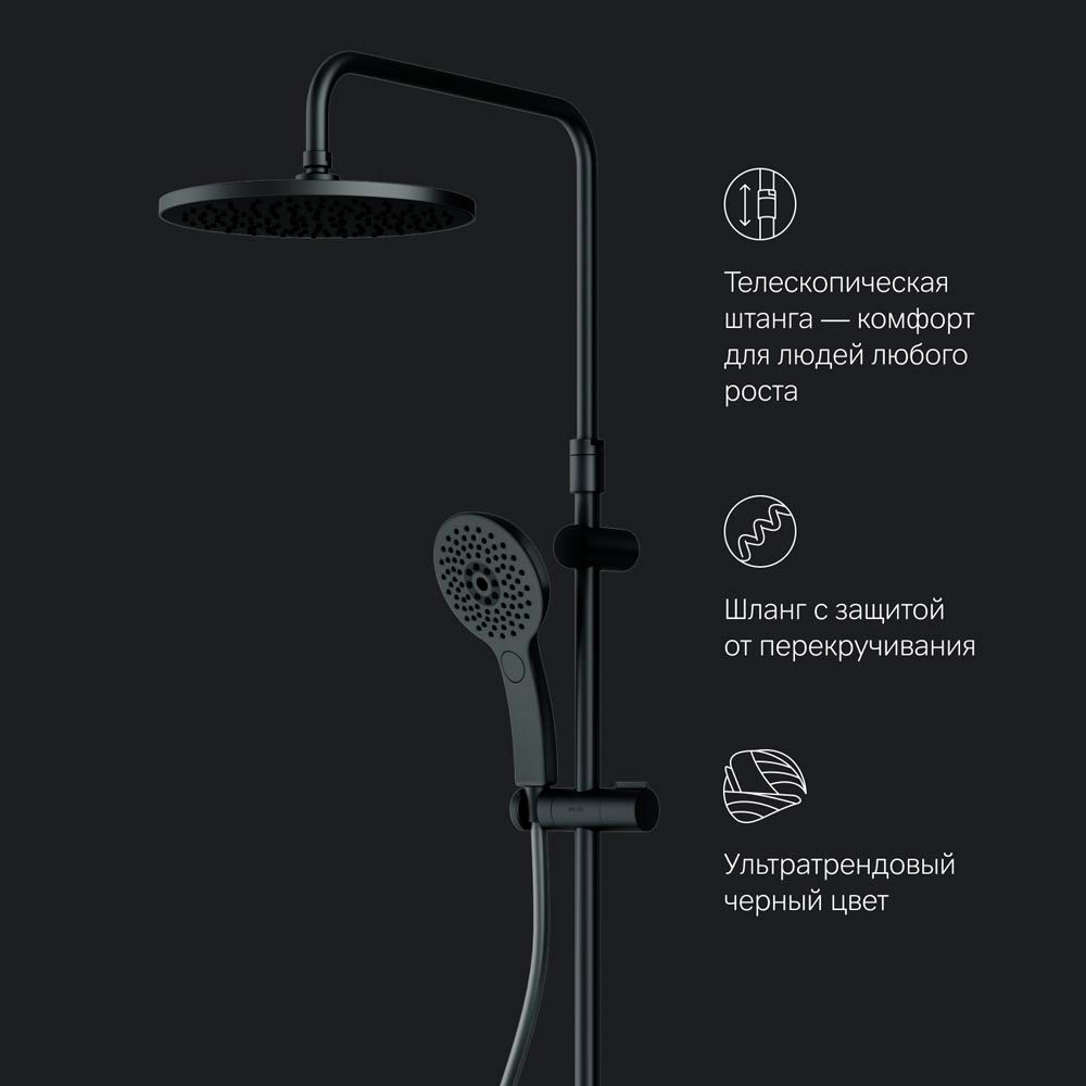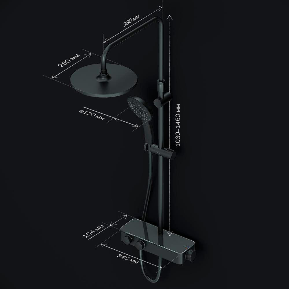 В комплектацию душевой системы входят: тропический душ, ручной душ, эксцентрики, держатели штанги и душа. Длина душевой штанги — 103-146 cм. Длина душевого шланга — 175 cм. Размер ручного душа — 12 cм. Диаметр верхнего душа —25 cм.