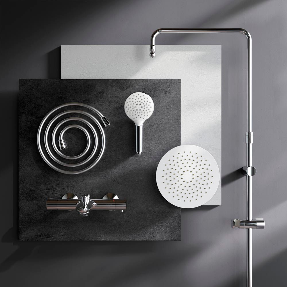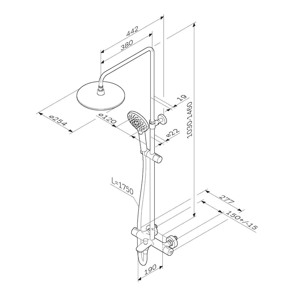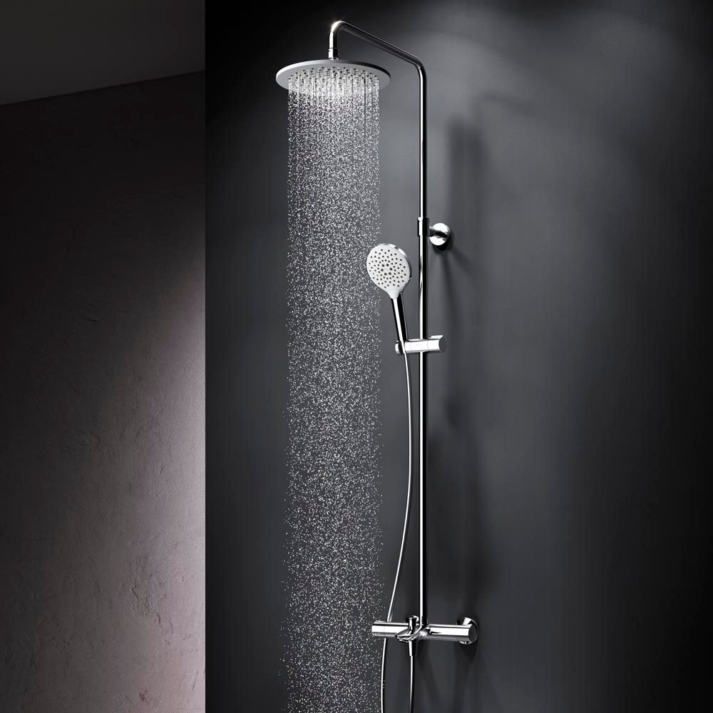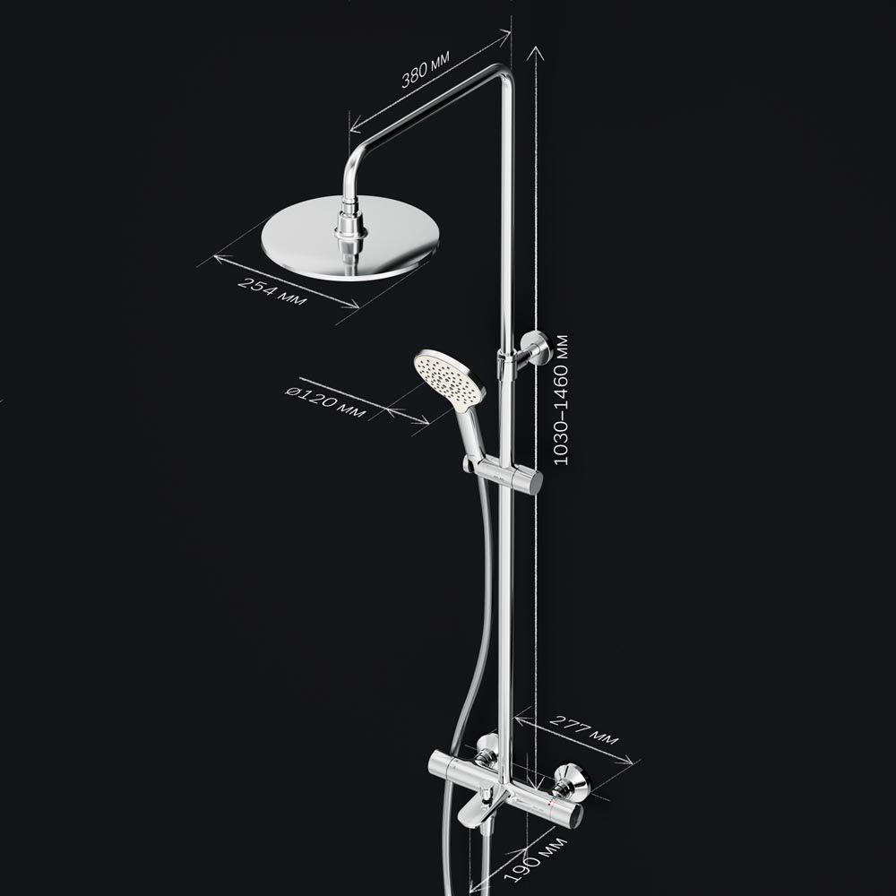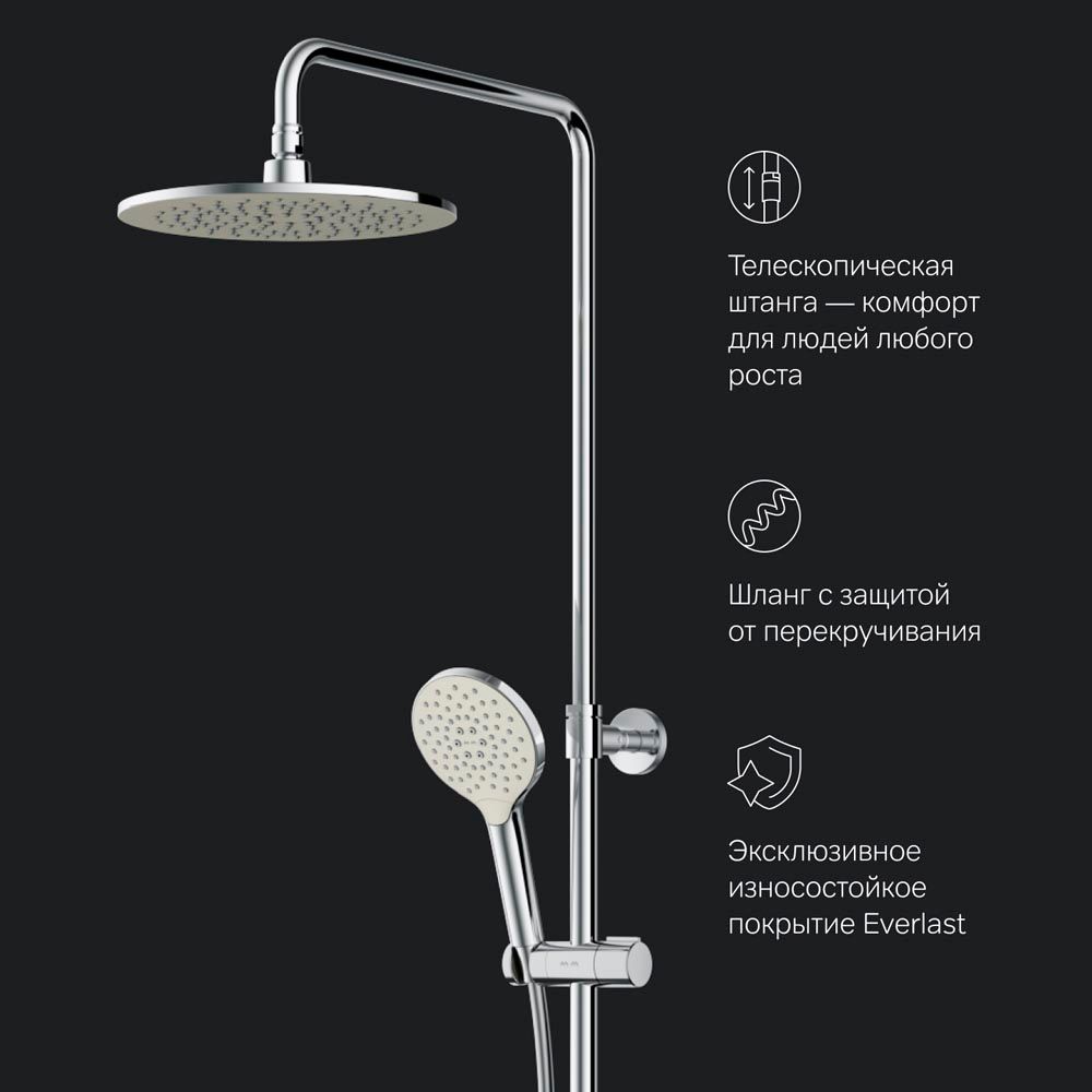 В комплектацию душевой системы входят: тропический душ, ручной душ, смеситель с изливом, эксцентрики, держатели штанги и душа. Длина душевой штанги — 103-146 см. Длина душевого шланга — 175 см. Размер ручного душа — 12 см. Диаметр верхнего душа — 25 см.