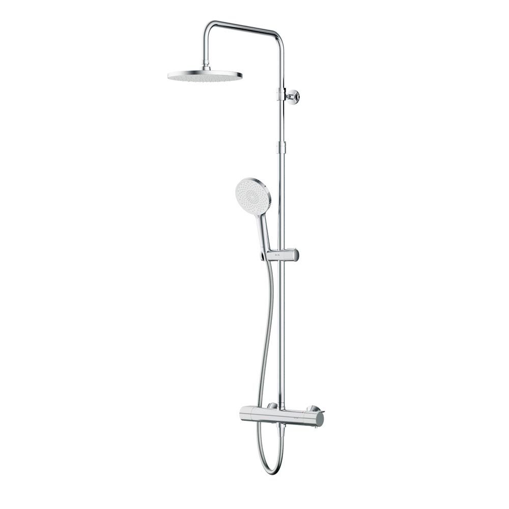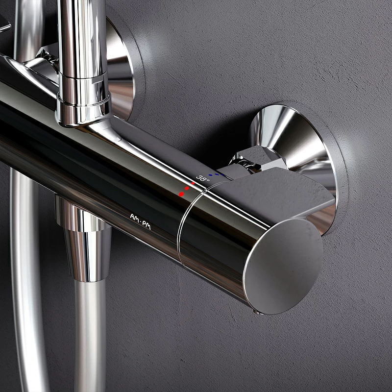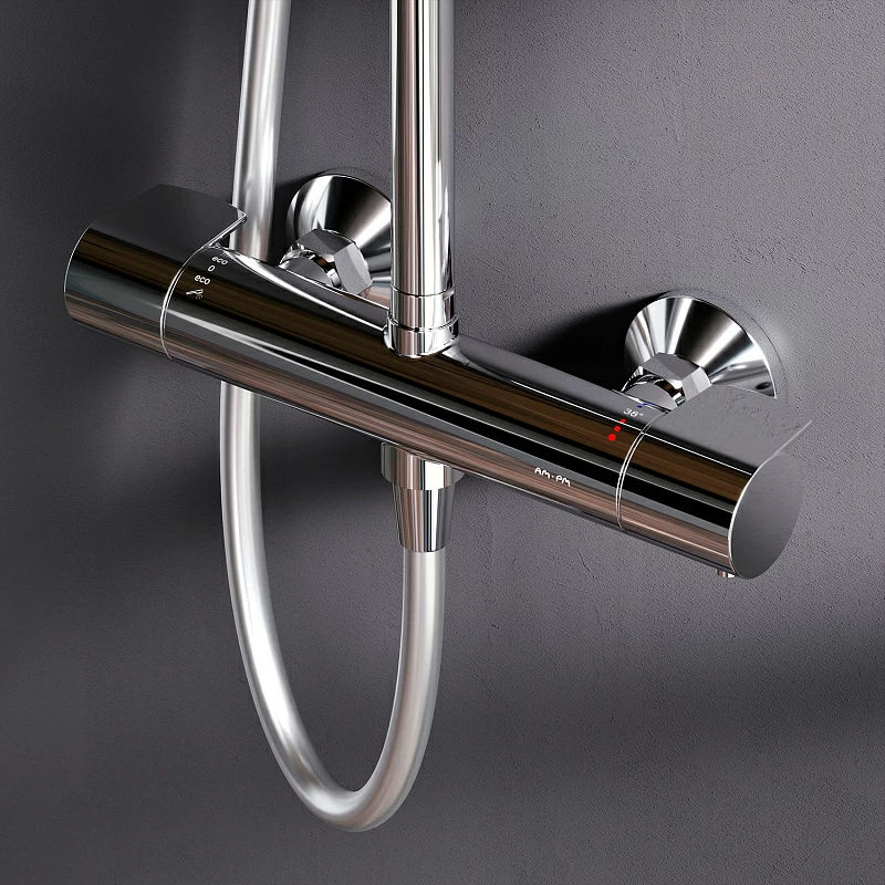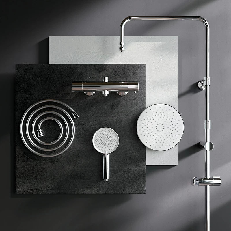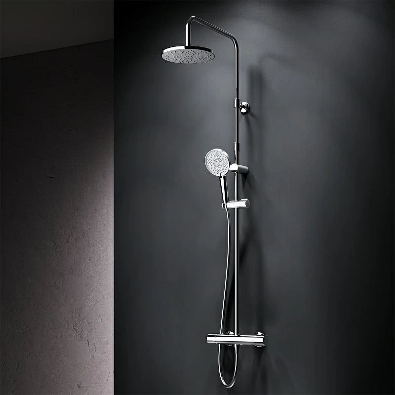 В комплектацию душевой системы входят: тропический душ, ручной душ, смеситель с термостатом, эксцентрики, держатели штанги и душа. Длина душевой штанги — 103-146 см. Длина душевого шланга — 175 см. Размер ручного душа — 12 см. Диаметр верхнего душа — 22,8 см.