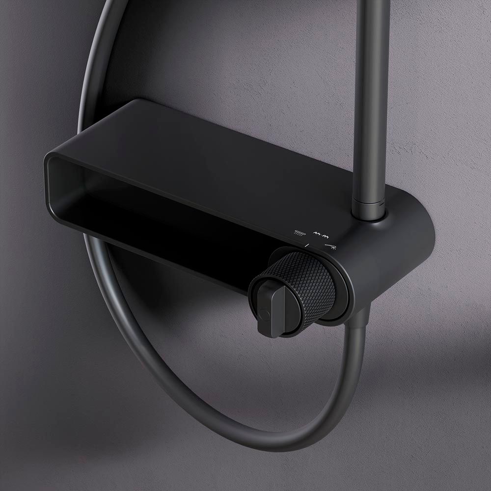 В центре этой системы — смеситель, выполненный в форме полочки и оснащенный дополнительной нишей, где все предметы первой необходимости, такие как шампунь или мыло, всегда на расстоянии руки. Это идеальный вариант для современной ванной, где порядок и удобство идут рука об руку с эстетикой.