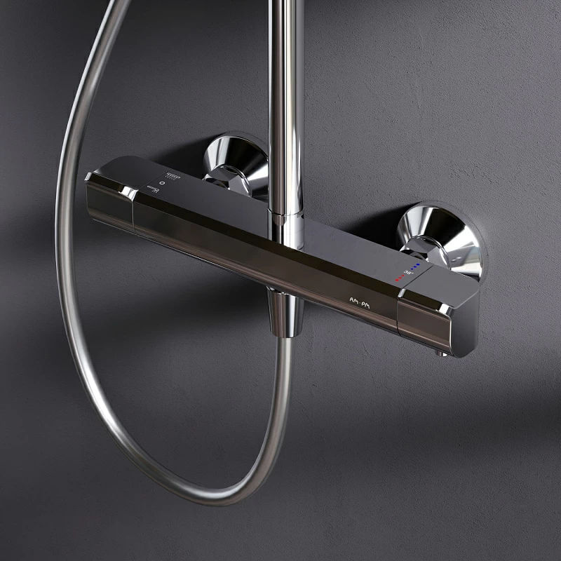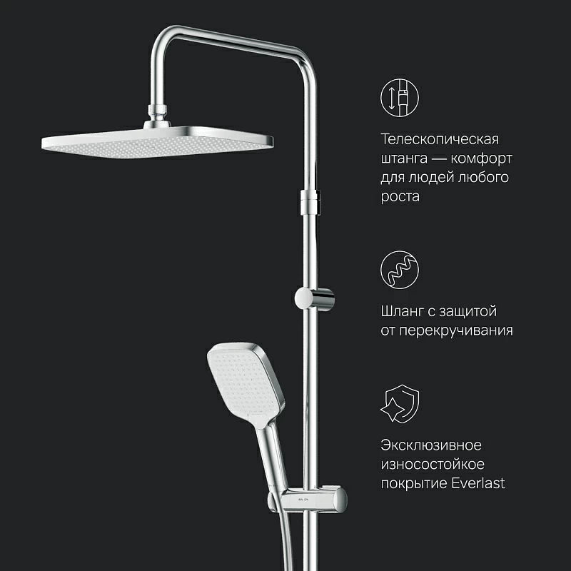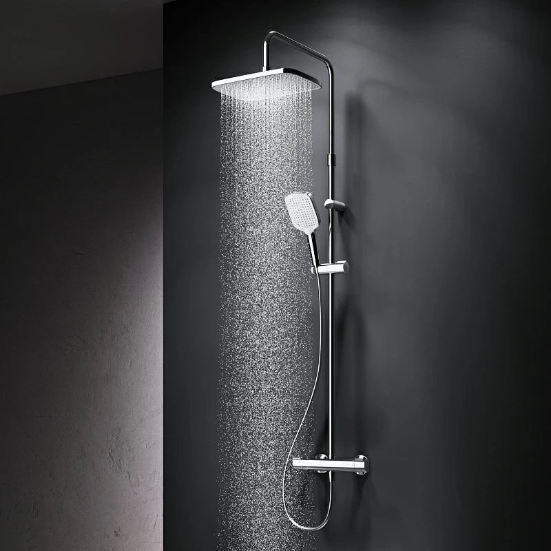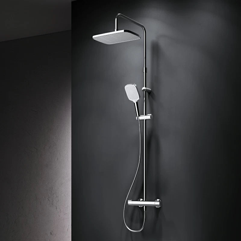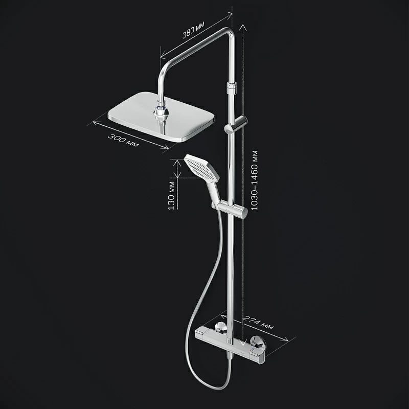 В комплектацию душевой системы входят: тропический душ, ручной душ, смеситель с термостатом, эксцентрики, держатели штанги и душа. Длина душевой штанги — 103-146 см. Длина душевого шланга — 175 см. Размер ручного душа — 13х10,3 см. Диаметр верхнего душа — 30х21 см.