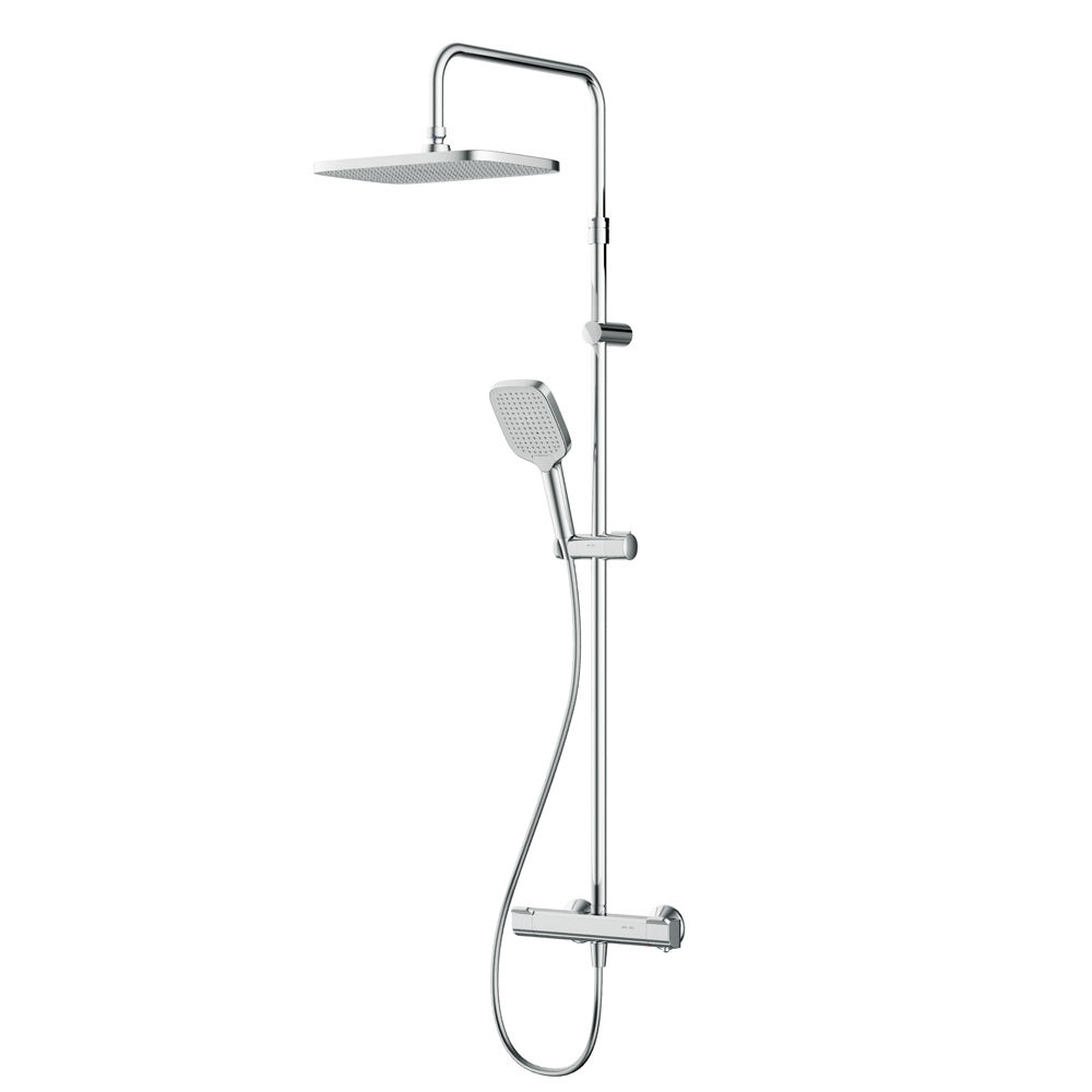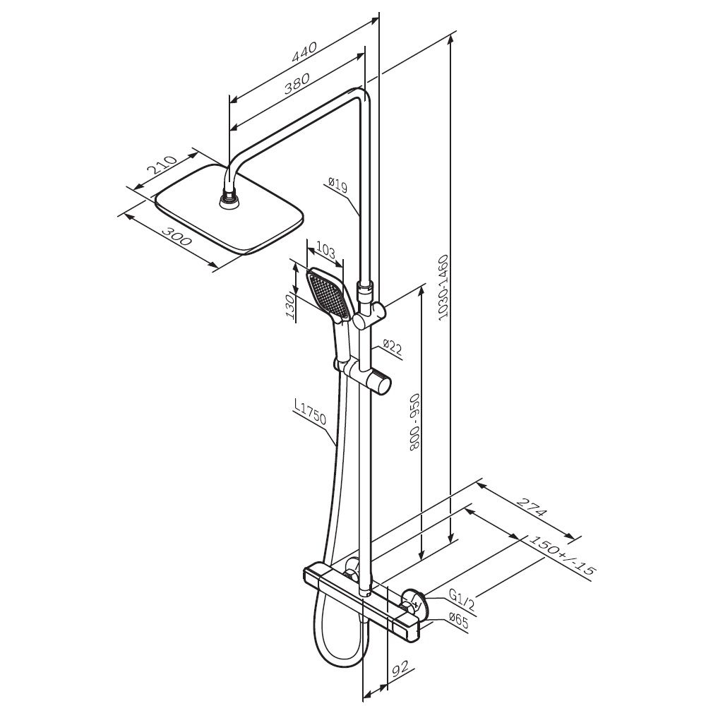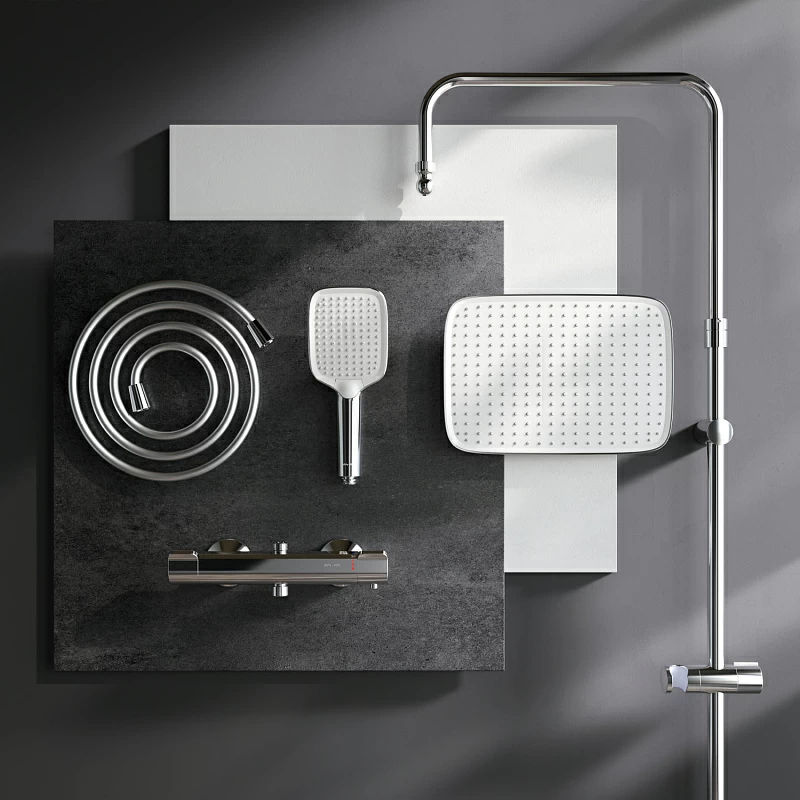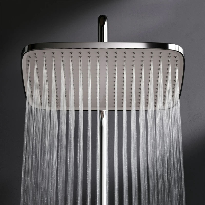 В комплектацию душевой системы входят: тропический душ, ручной душ, смеситель с термостатом, эксцентрики, держатели штанги и душа. Длина душевой штанги — 103-146 см. Длина душевого шланга — 175 см. Размер ручного душа — 13х10,3 см. Диаметр верхнего душа — 30х21 см.