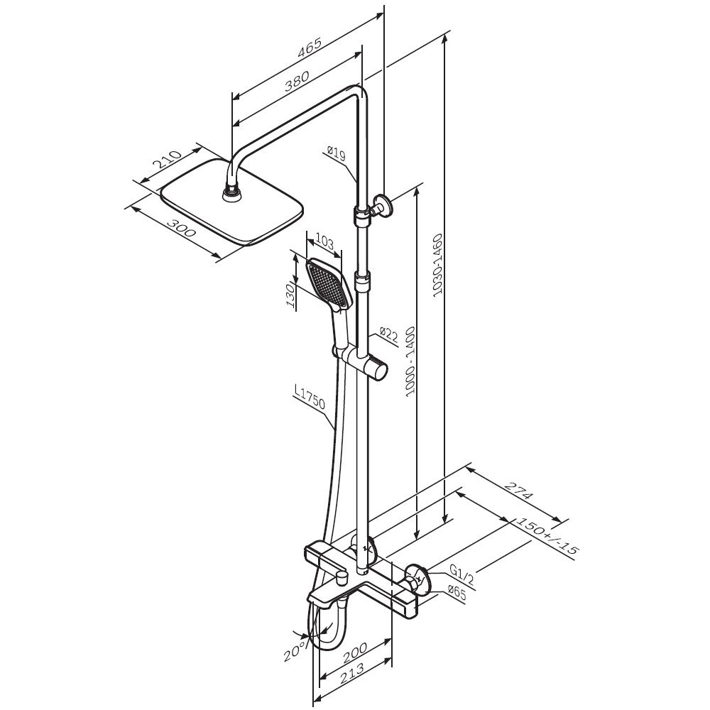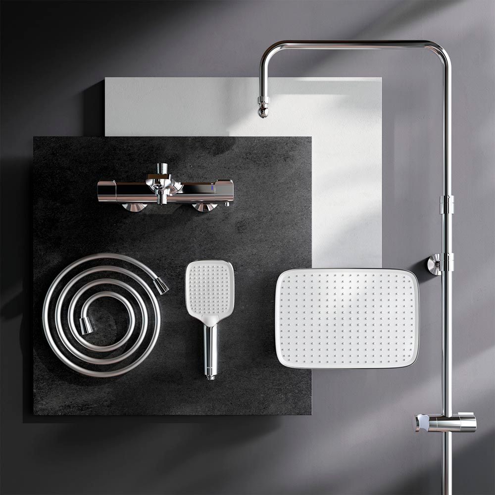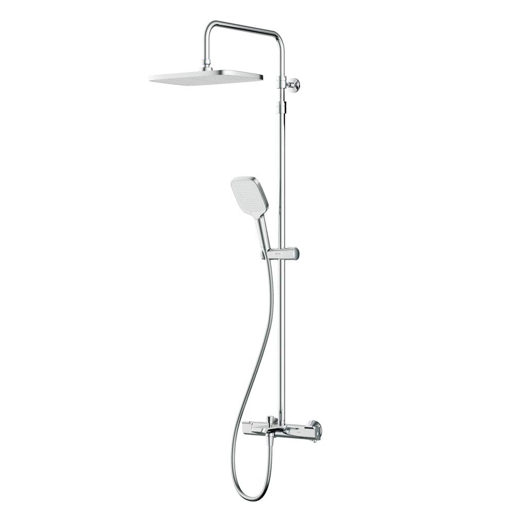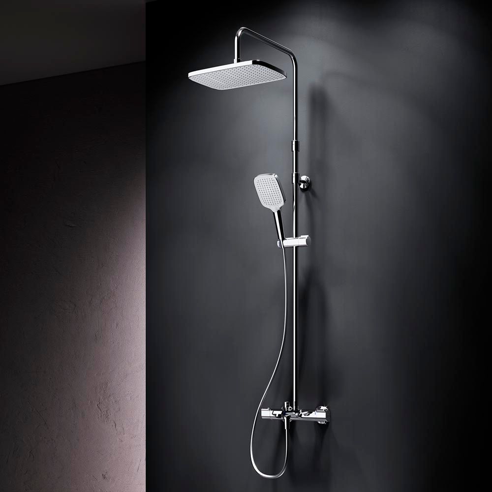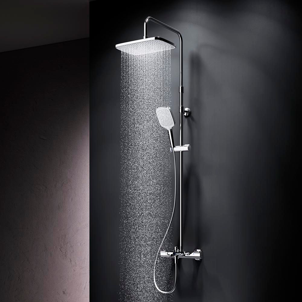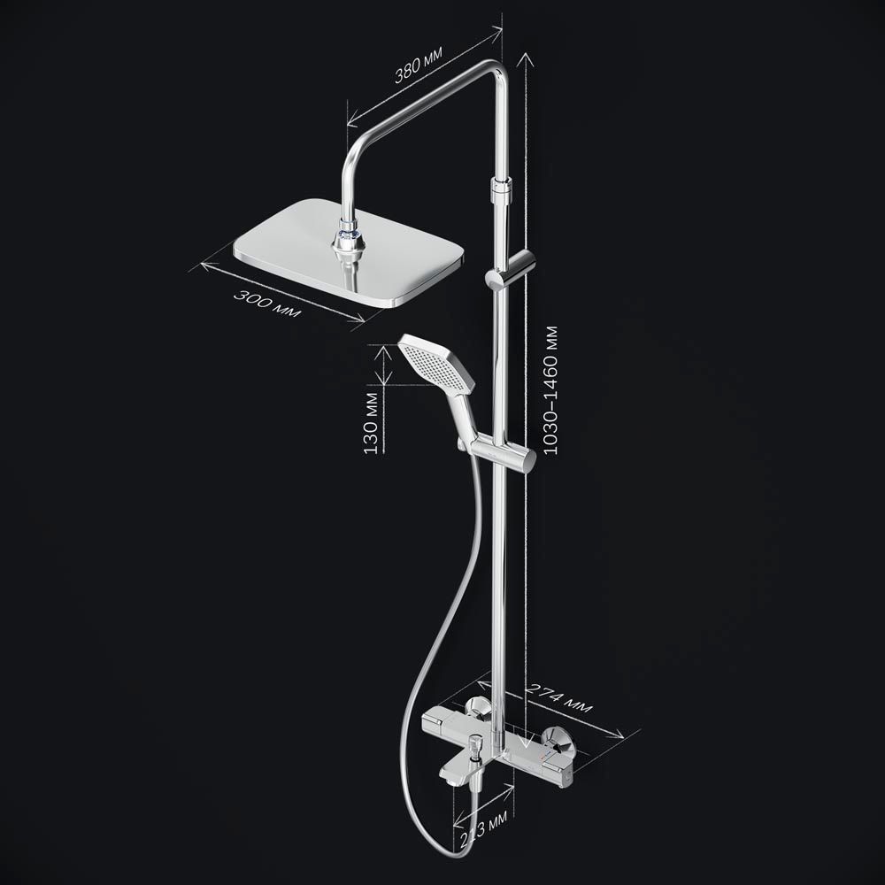 В комплектацию душевой системы входят: тропический душ, ручной душ, смеситель с термостатом и изливом, эксцентрики, держатели штанги и душа. Длина душевой штанги - 103-146 см. Длина душевого шланга - 175 см. Размер ручного душа - 13х10,3 см. Диаметр верхнего душа - 30х21 см.