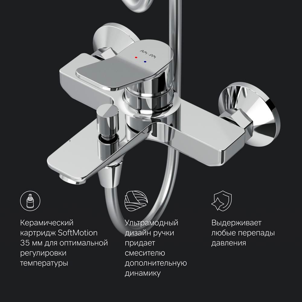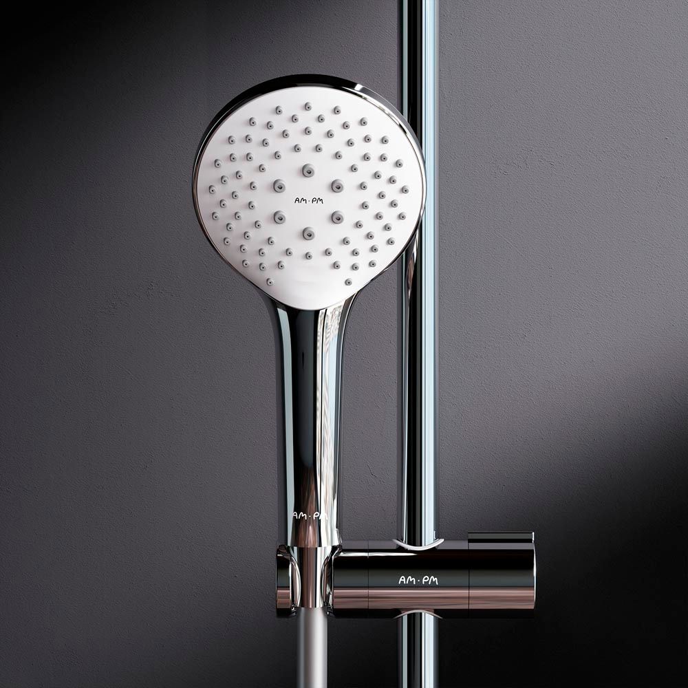 Готовое решение душевой системы со смесителем от бренда AM.PM коллекции X-Joy. Модный дизайн ручки придает смесителю дополнительную динамику и дарит непревзойденную легкость управления. Длина душевого шланга — 175 см. Размер ручного душа — 11 см. Диаметр верхнего душа — 22 см.