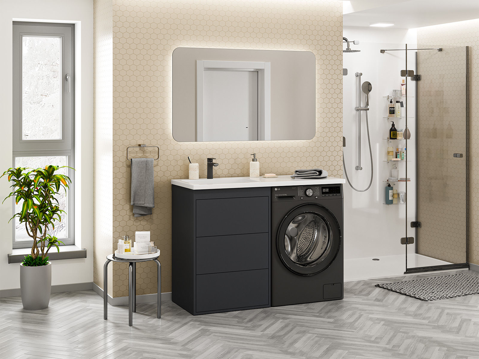 Коллекция Grafit выполнена в модных и актуальных цветах, что позволяет подобрать идеальный вариант для любого интерьера. Напольные тумбы с 3-мя ящиками не только добавят стиля вашей ванной комнате, но и обеспечат удобное хранение необходимых вещей. А специальная конструкция тумбы под стиральную машину позволит использовать пространство ванной комнаты максимально эффективно.