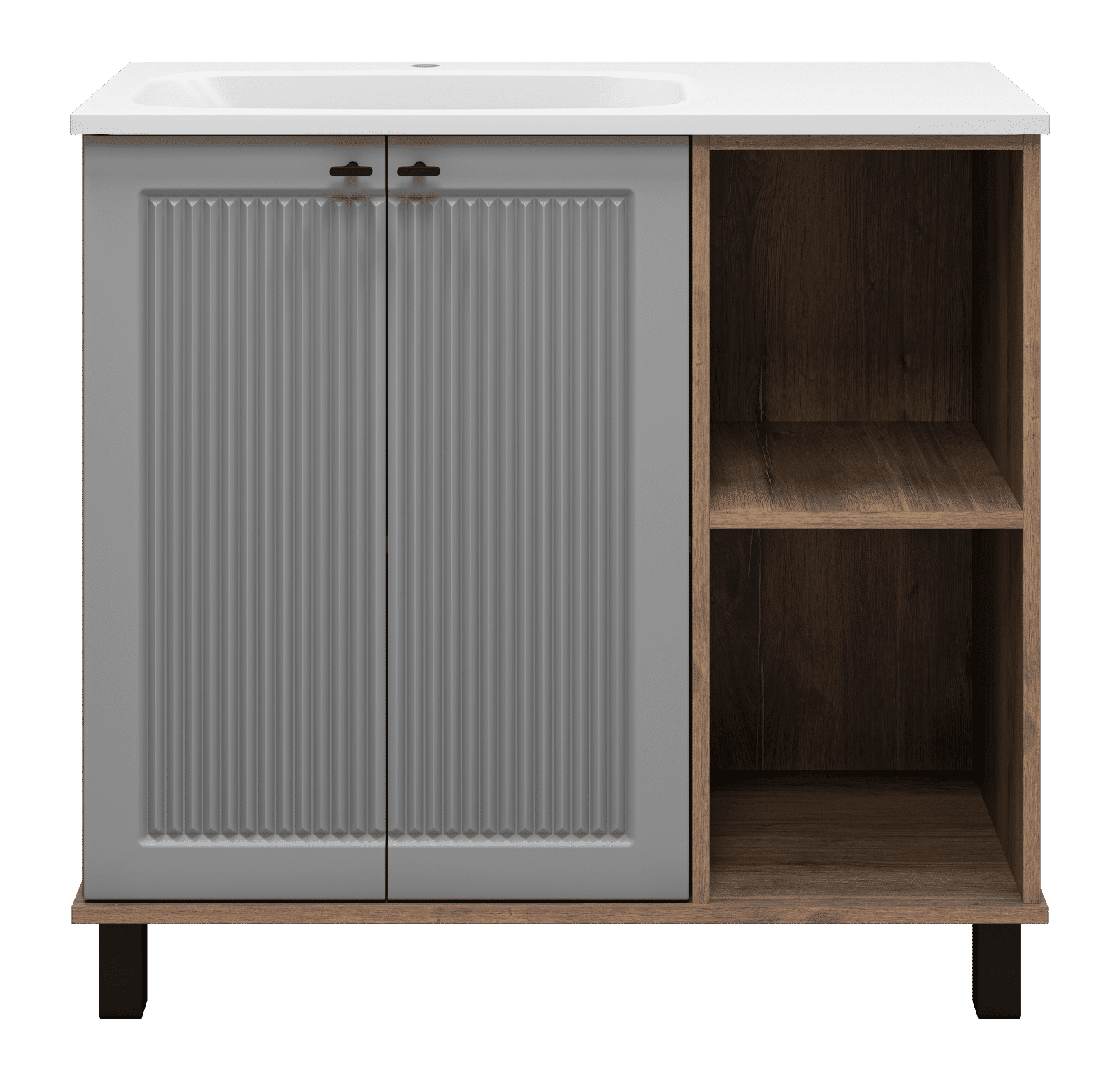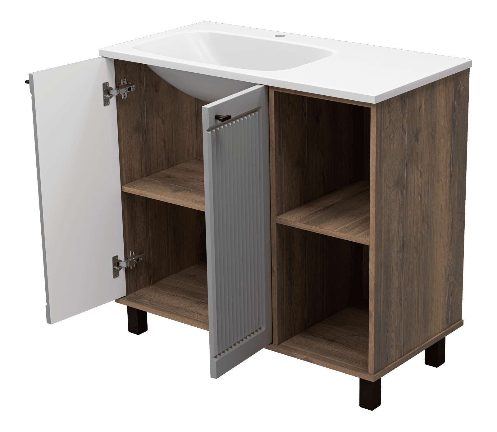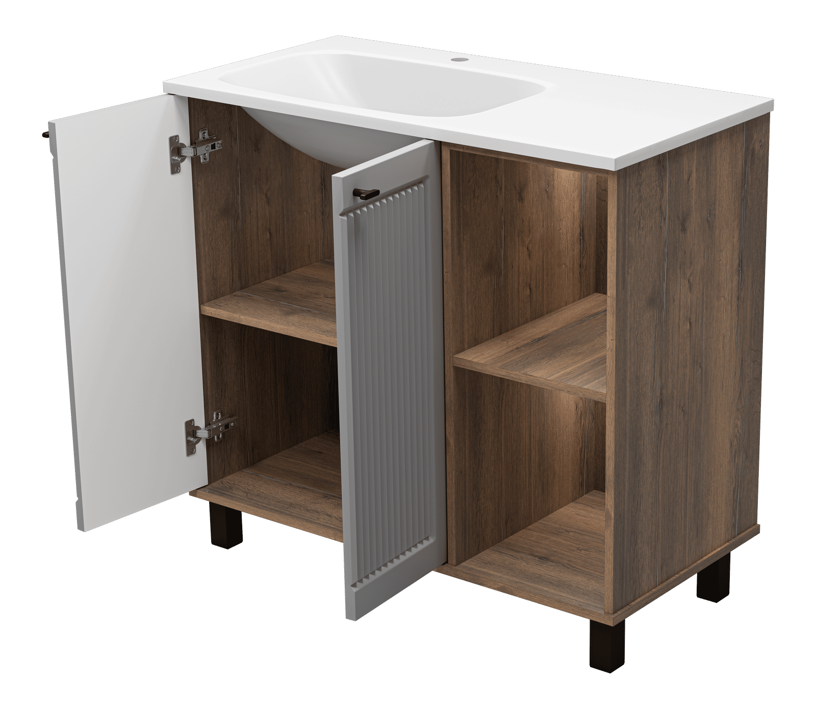 Монтаж напольного типа обеспечивает стабильность и удобство в использовании. Передние и задние регулируемые опоры позволяют легко подстроить тумбу под любые неровности пола, обеспечивая идеальную установку. Дверцы с доводчиками гарантируют плавное и бесшумное закрытие, а стильные черные ручки добавляют современный штрих.