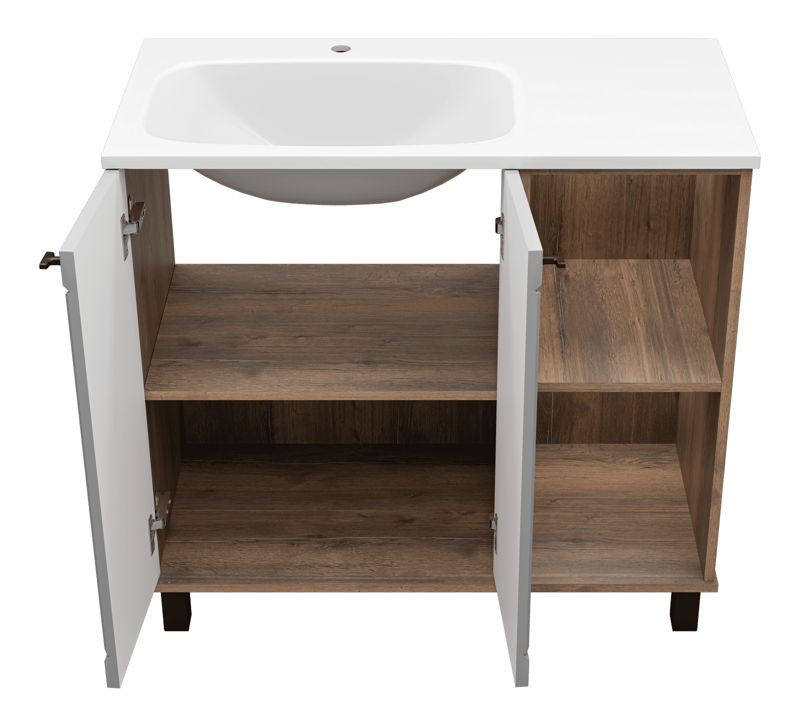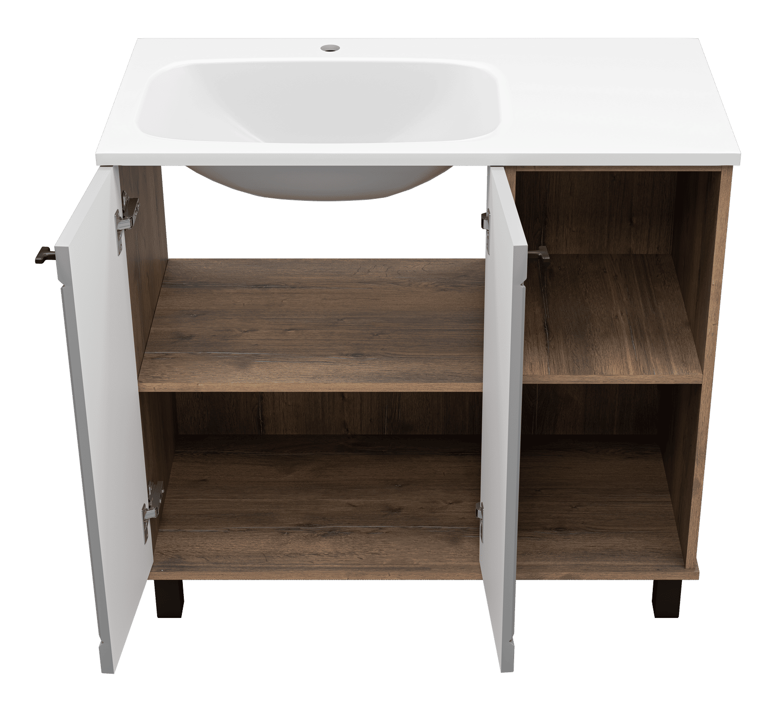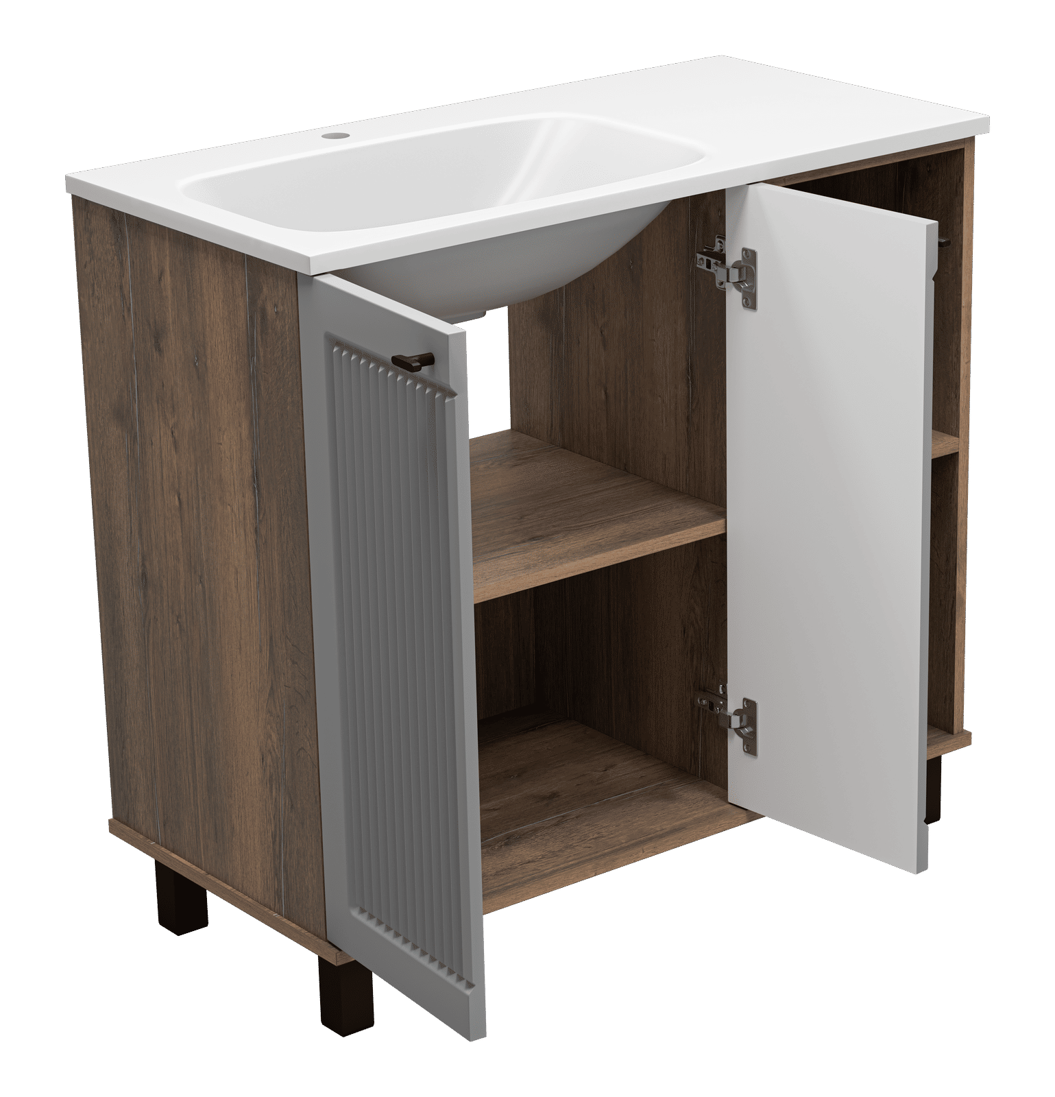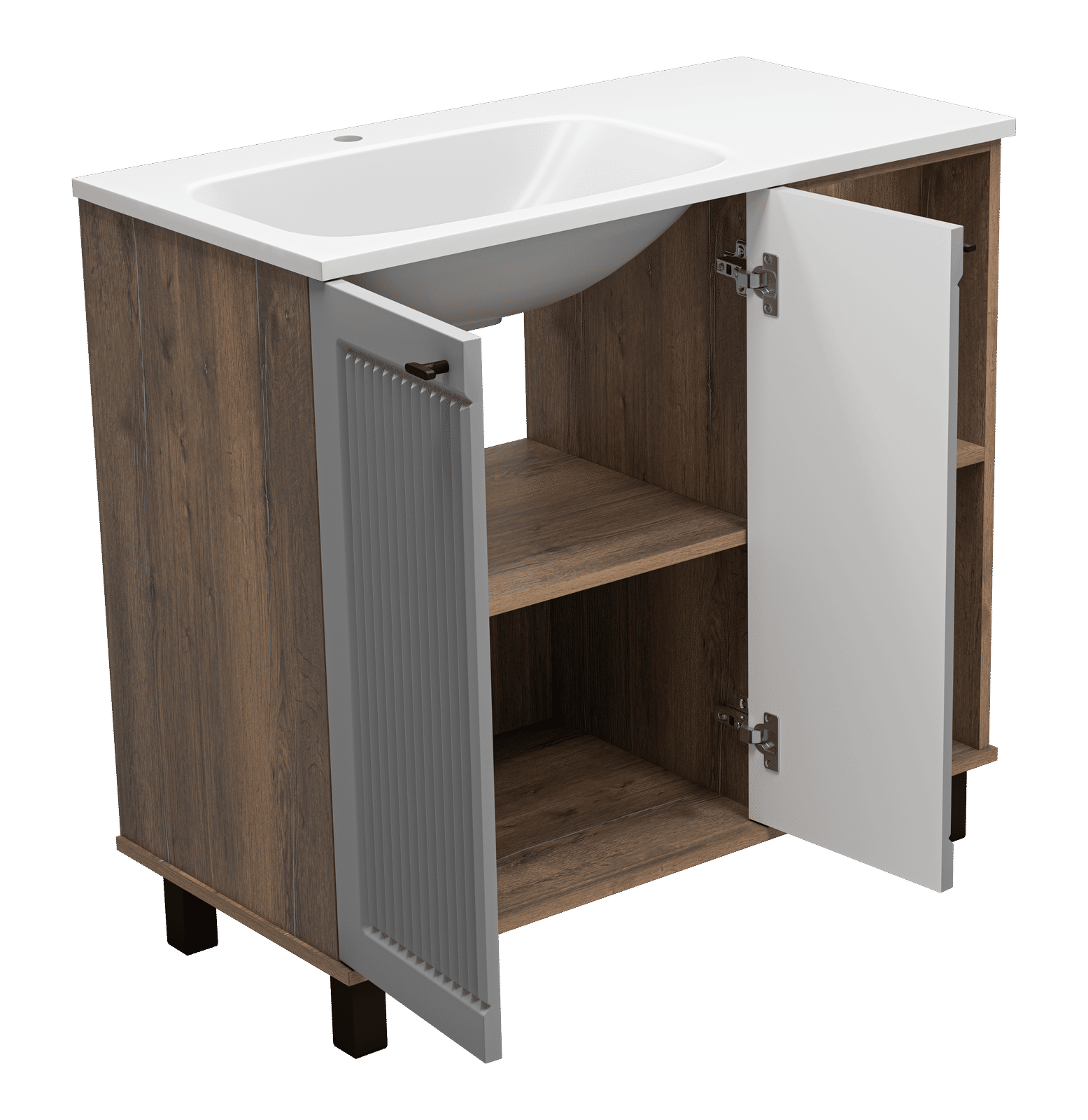 Монтаж напольного типа обеспечивает стабильность и удобство в использовании. Передние и задние регулируемые опоры позволяют легко подстроить тумбу под любые неровности пола, обеспечивая идеальную установку. Дверцы с доводчиками гарантируют плавное и бесшумное закрытие, а стильные черные ручки добавляют современный штрих.
