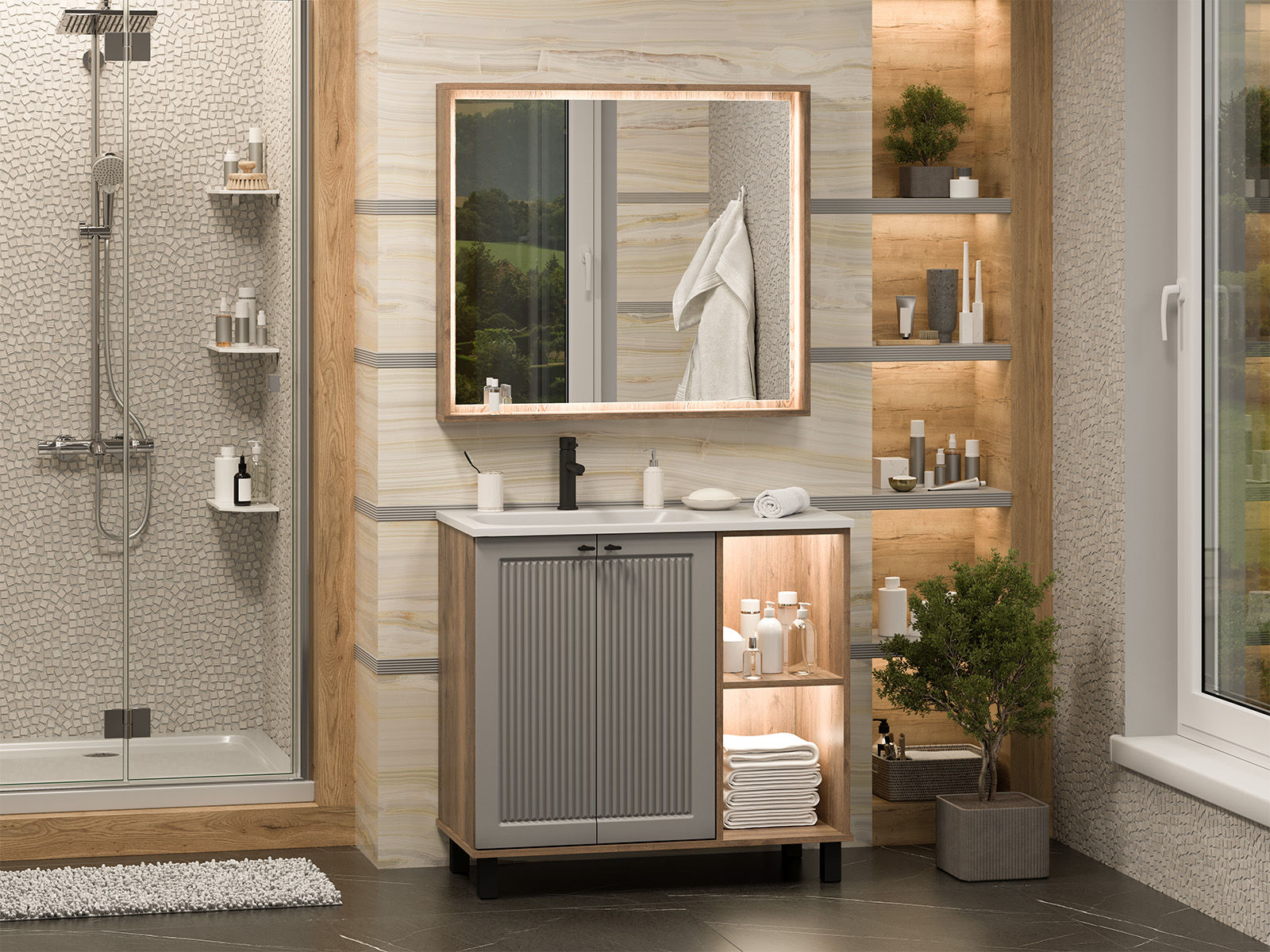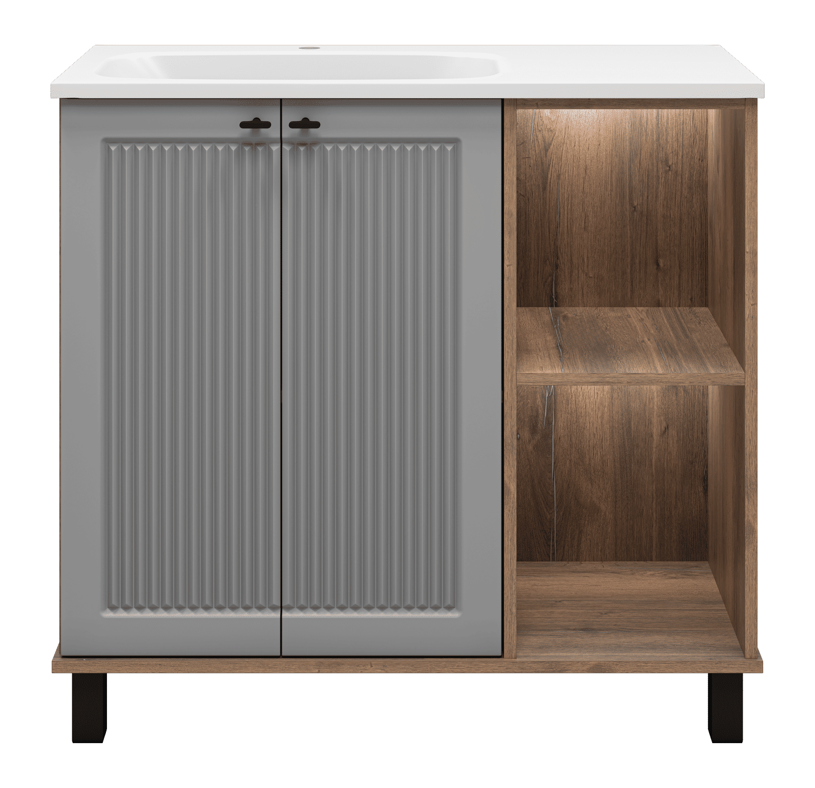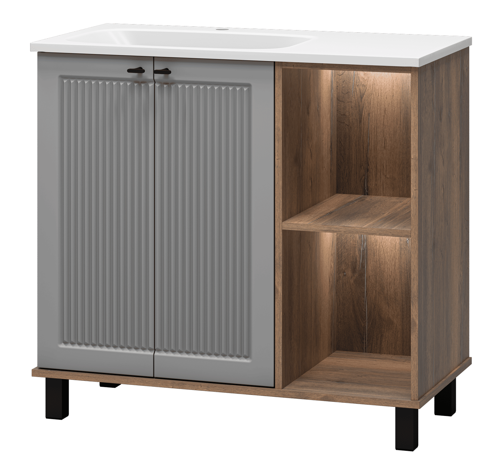 Тумба под раковину Brevita Lumus оснащена двумя дверцами, за которыми скрываются удобные полки для хранения ваших принадлежностей. Также имеются открытые полки с подсветкой создают атмосферу уюта и стиля, благодаря использованию светодиодной ленты.