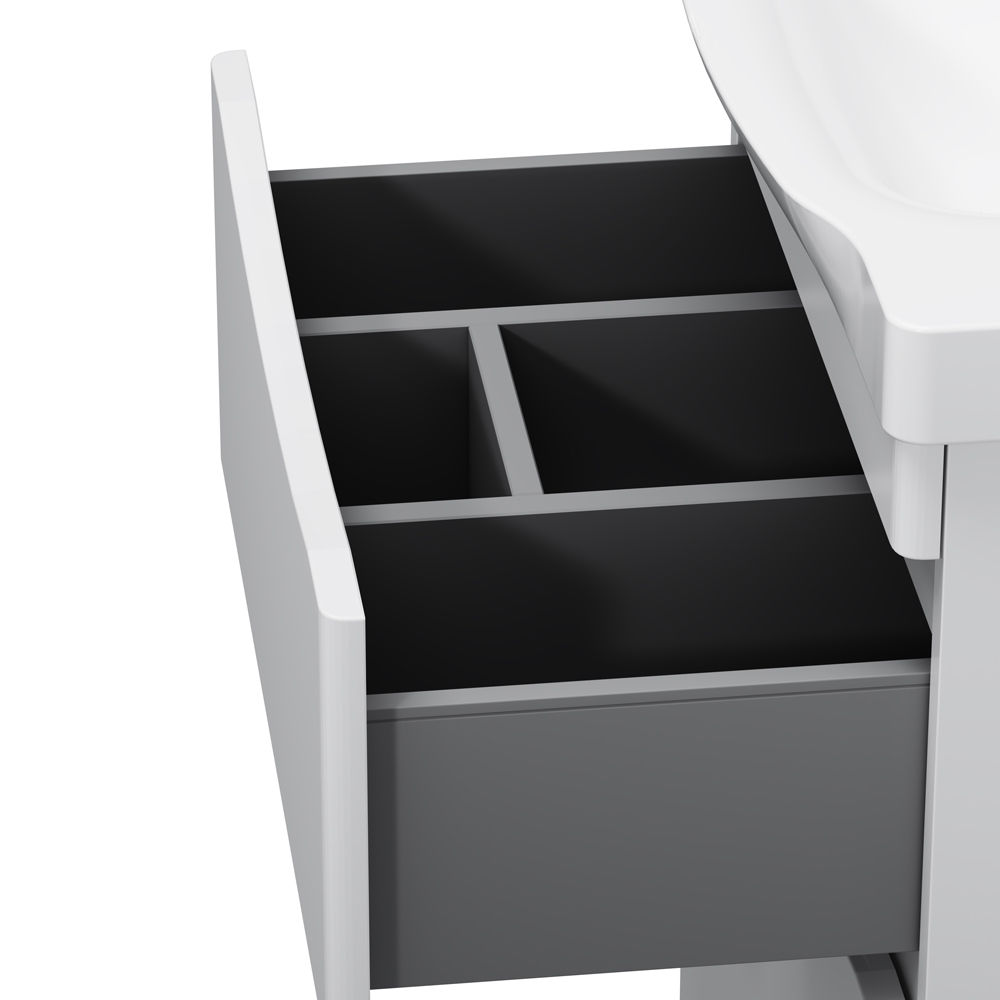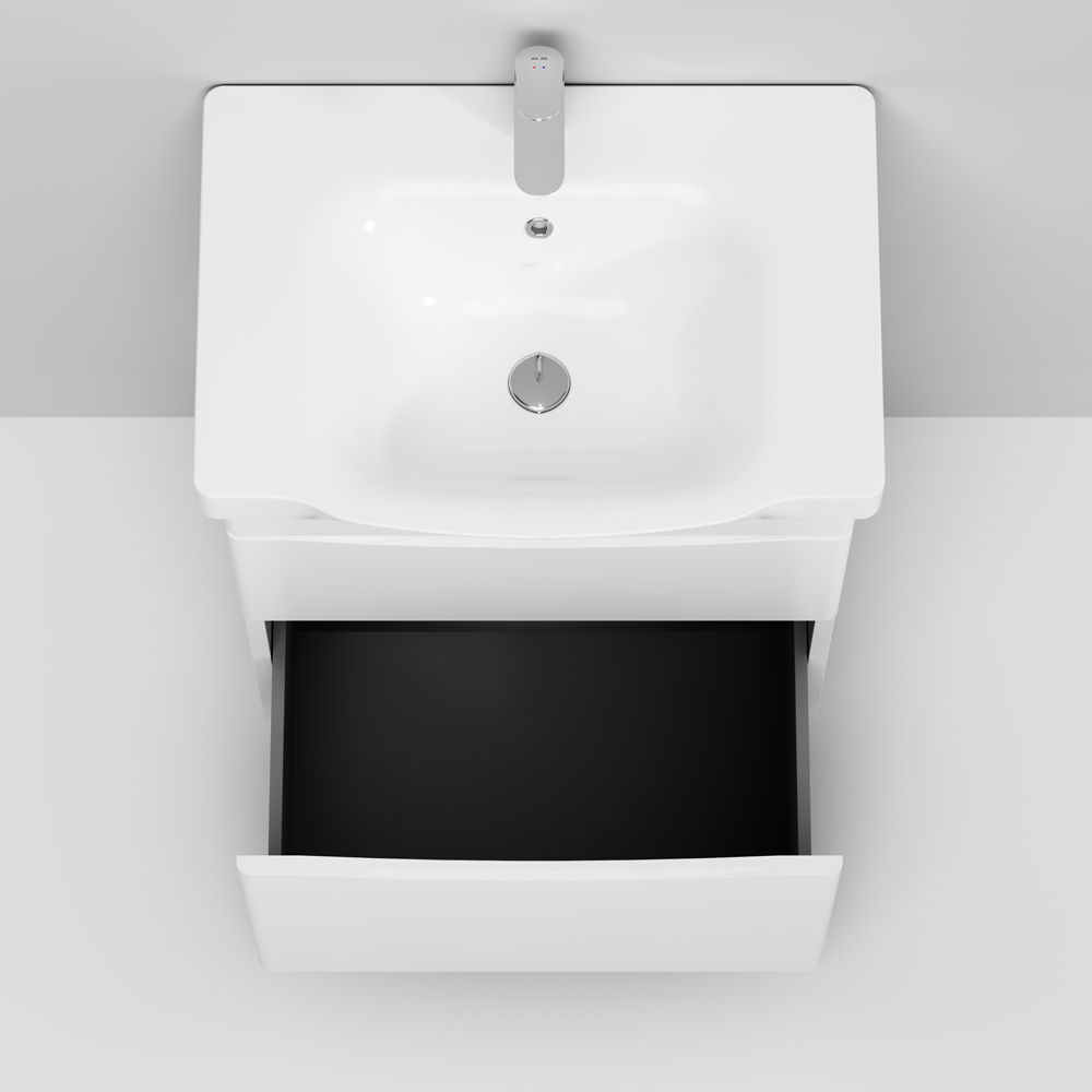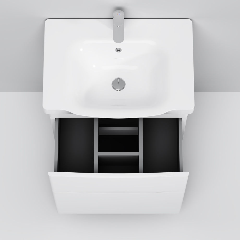 Тумба под раковину бренда AM.PM коллекции Like в стиле Dynamic Organic имеет самое мягкое открытие и закрытие ящиков в классе за счет направляющих скрытого монтажа с системой мягкого закрывания soft close.