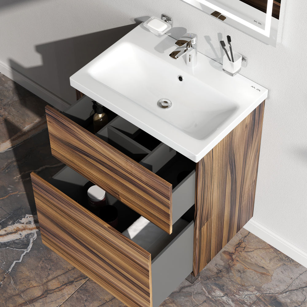 Тумба под раковину бренда AM.PM коллекции Gem изготовлена из влагостойкого ЛДСП. Внутреннее пространство двух вместительных ящиков с антискользящим эффектом. В верхнем ящике находится удобный органайзер для хранения гигиенических принадлежностей. Благодаря системе отделений органайзера, каждый предмет имеет свое место, что обеспечивает порядок и удобство при использовании. Такая система хранения позволяет экономить место и помогает поддерживать чистоту ванной комнаты. Фурнитура push-to-open — открытие ящика легким нажатием на фасад. Направляющие скрытого монтажа обеспечивают плавное выдвижение ящиков.