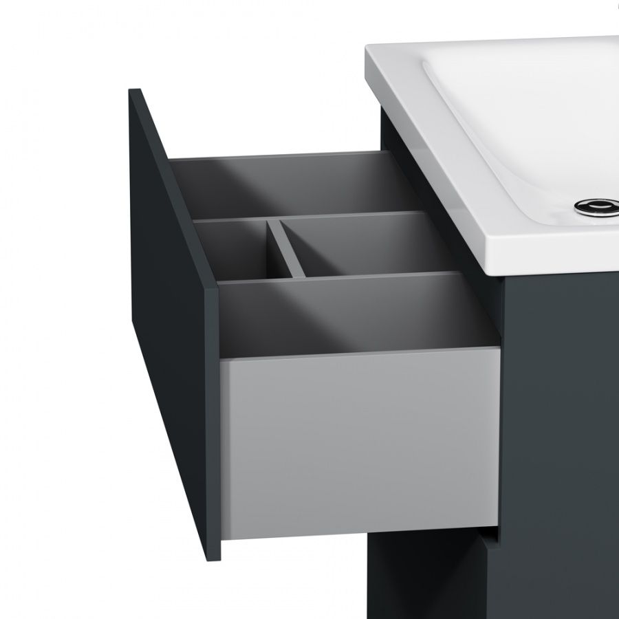 Тумба под раковину бренда AM.PM коллекции Gem изготовлена из влагостойкого ЛДСП. Внутреннее пространство двух вместительных ящиков с антискользящим эффектом. В верхнем ящике находится удобный органайзер для хранения гигиенических принадлежностей. Благодаря системе отделений органайзера, каждый предмет имеет свое место, что обеспечивает порядок и удобство при использовании. Такая система хранения позволяет экономить место и помогает поддерживать чистоту ванной комнаты. Фурнитура push-to-open — открытие ящика легким нажатием на фасад. Направляющие скрытого монтажа обеспечивают плавное выдвижение ящиков.
