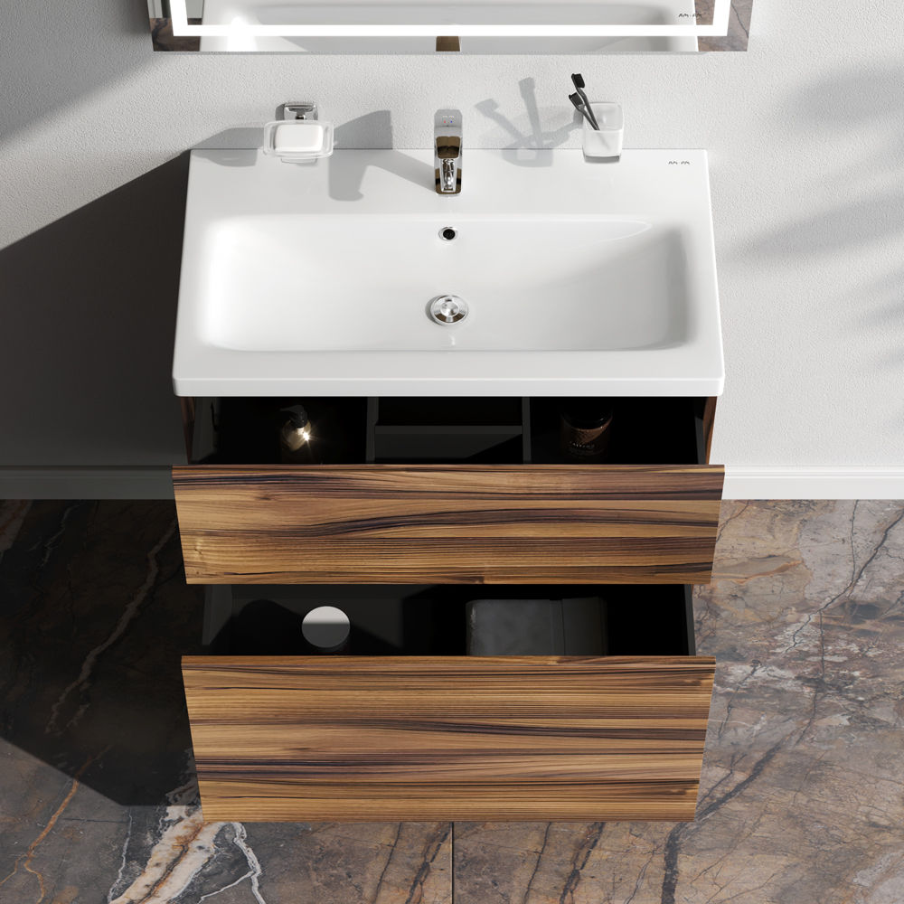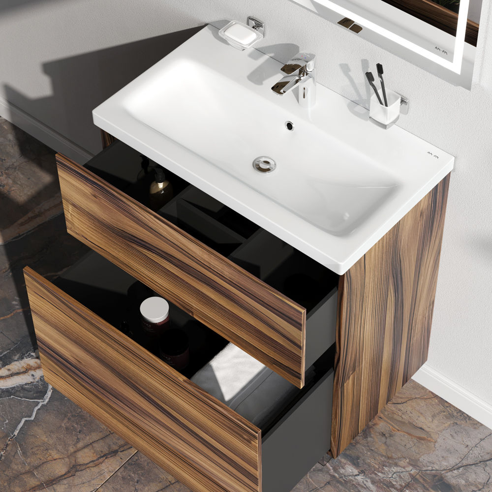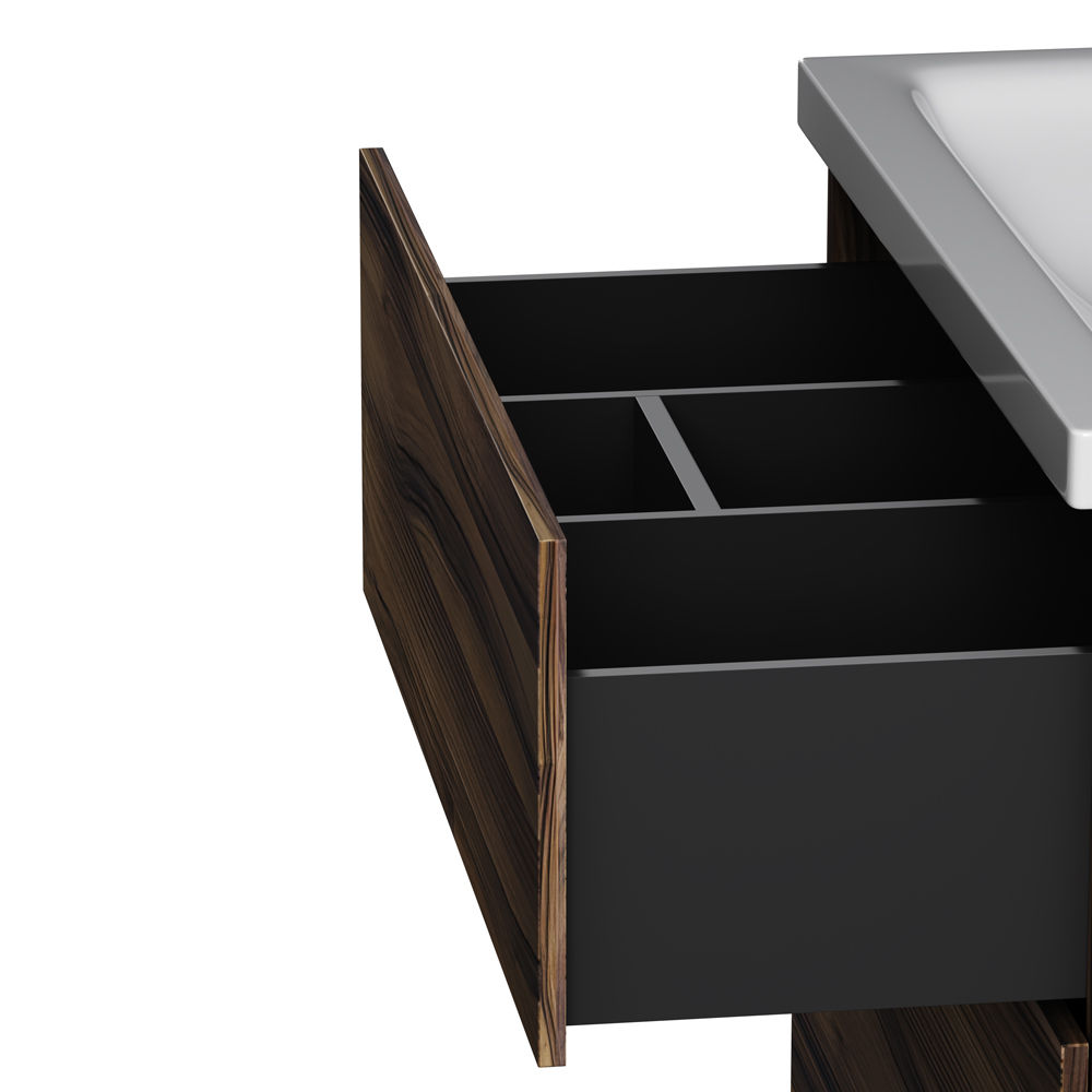 Тумба под раковину бренда AM.PM коллекции Gem изготовлена из влагостойкого ЛДСП. Внутреннее пространство двух вместительных ящиков с антискользящим эффектом. В верхнем ящике находится удобный органайзер для хранения гигиенических принадлежностей. Благодаря системе отделений органайзера, каждый предмет имеет свое место, что обеспечивает порядок и удобство при использовании. Такая система хранения позволяет экономить место и помогает поддерживать чистоту ванной комнаты. Фурнитура push-to-open — открытие ящика легким нажатием на фасад. Направляющие скрытого монтажа обеспечивают плавное выдвижение ящиков.