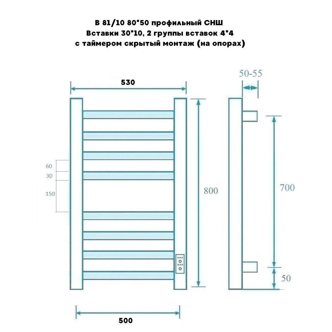 Электрический полотенцесушитель Маргроид Ferrum Вид 81/10 изготовлен из конструкционной стали. Устанавливается на 4 опоры. Внутри полотенцесушителя протянут нагревательный шнур. С правой стороны установлен диммер со световой индикацией, позволяющий выставить температуру и таймер нагрева.