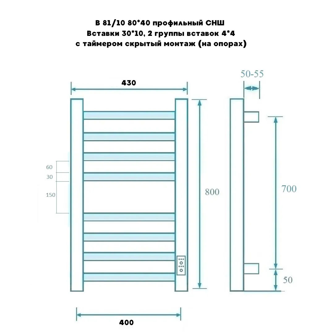 Полотенцесушитель электрический Маргроид Ferrum Вид 81/10 СНШ профильный (перекладины 30x10, 4+4) 80/40 Белый матовый, скрытого монтажа, таймер справа