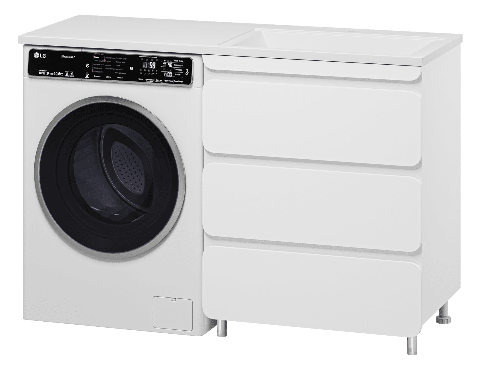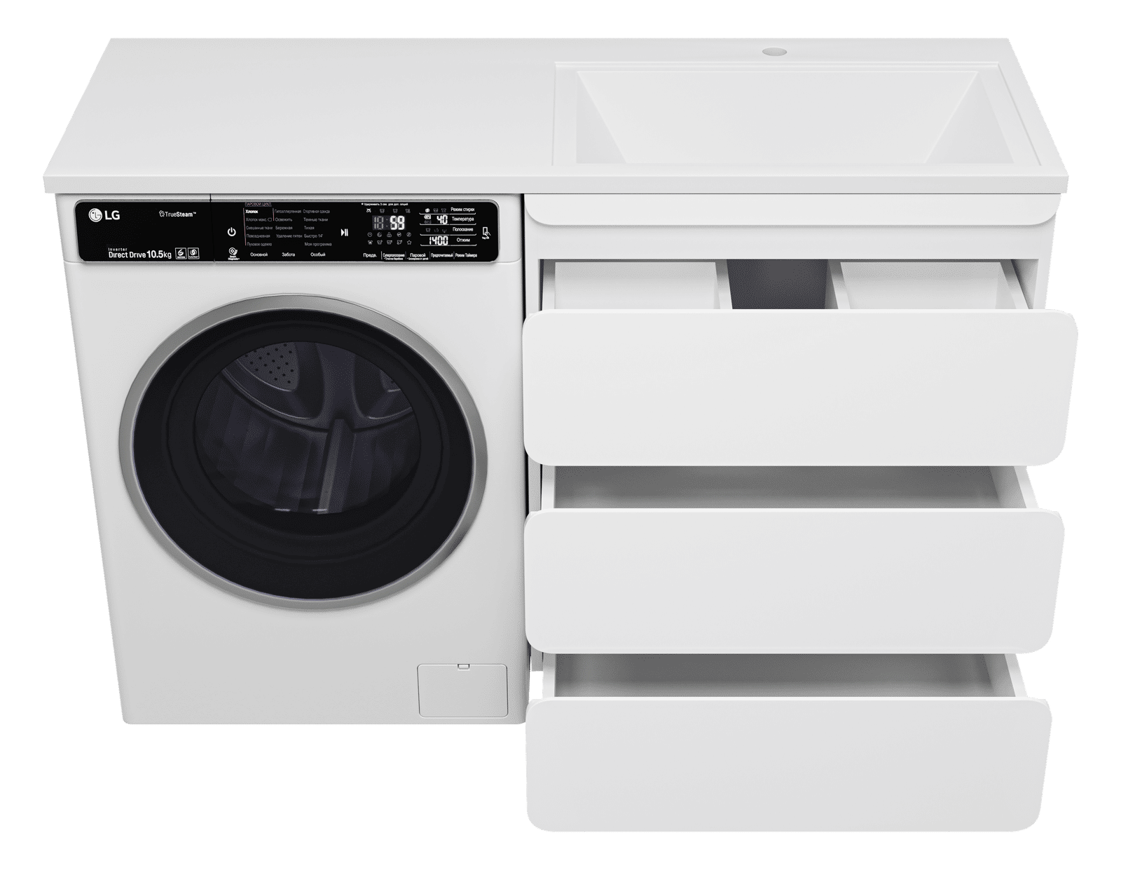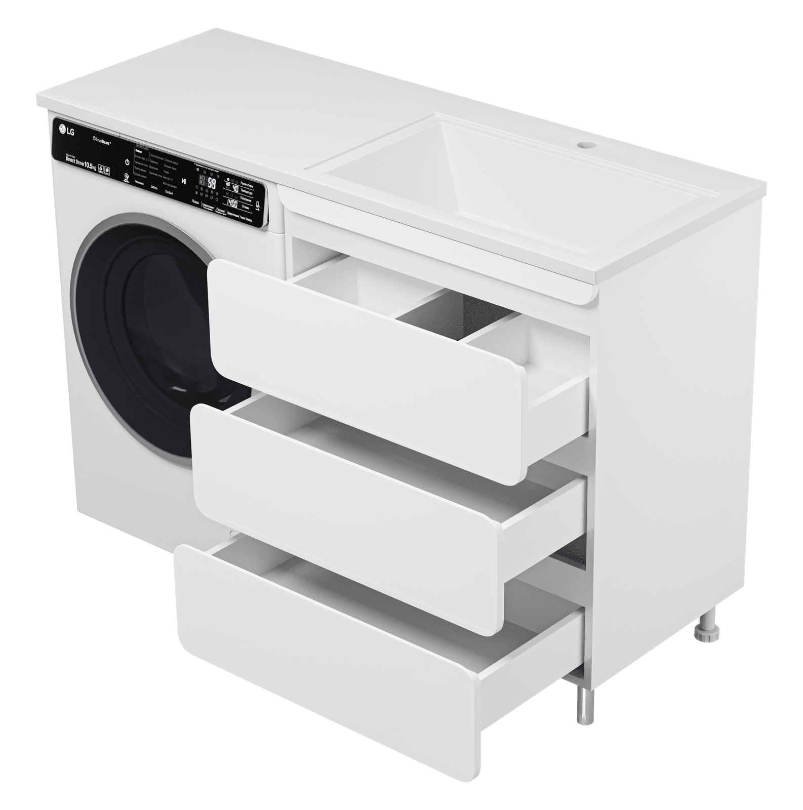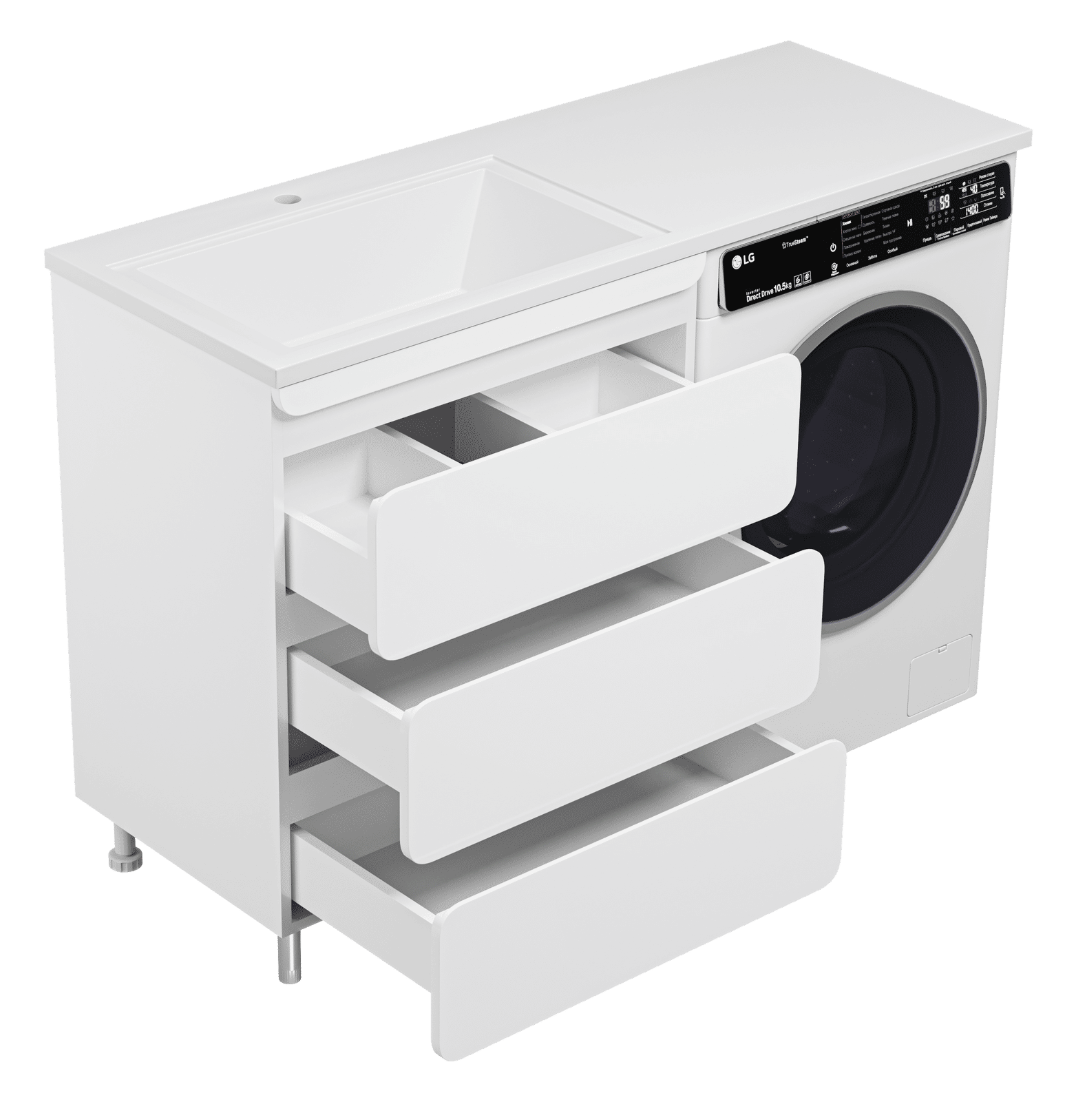 Выдвижные ящики оснащены направляющими со скрытыми доводчиками, которые обеспечивают плавное выдвижение и бесшумную работу механизмов.