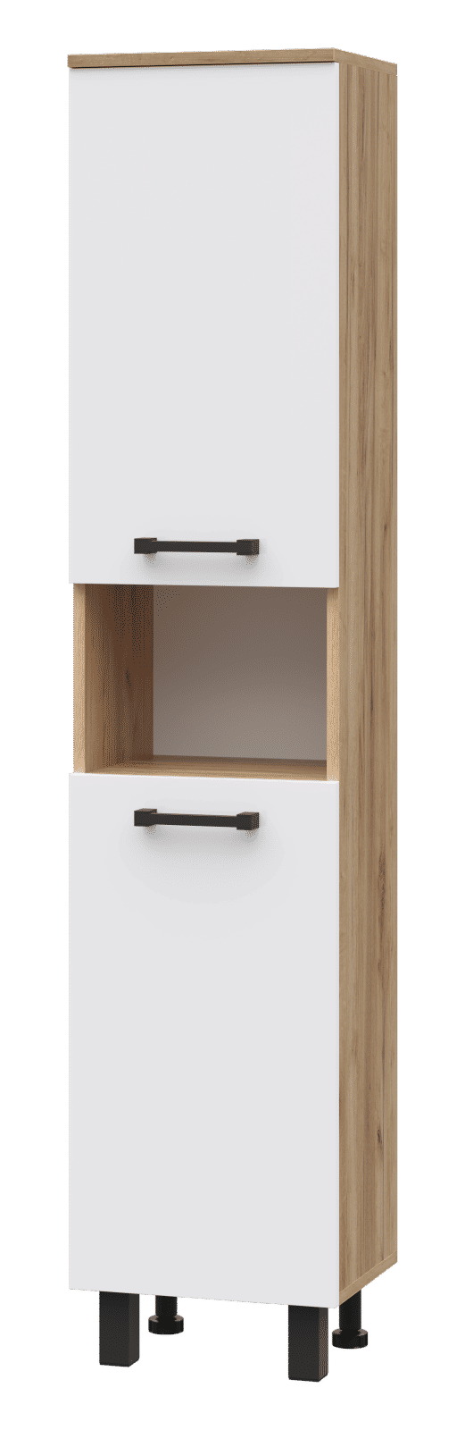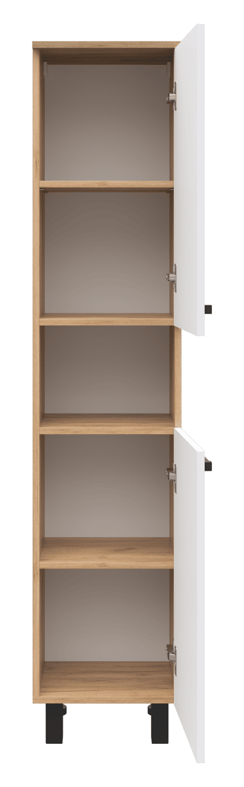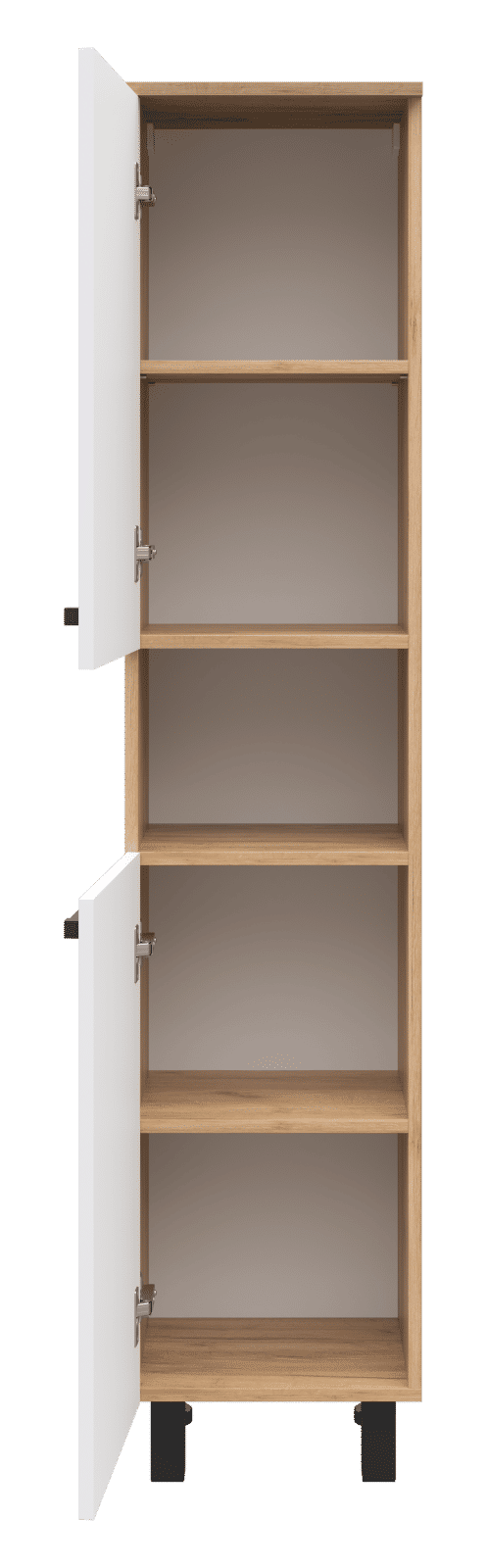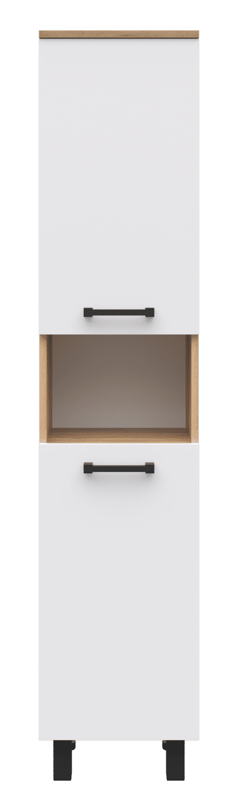 Пенал выполнен в одном исполнении с шириной 35 см. У шкафа есть два распашных фасада, между которыми находится открытая ниша. Дверцы могут открываться вправо и влево (в зависимости от установки петель).