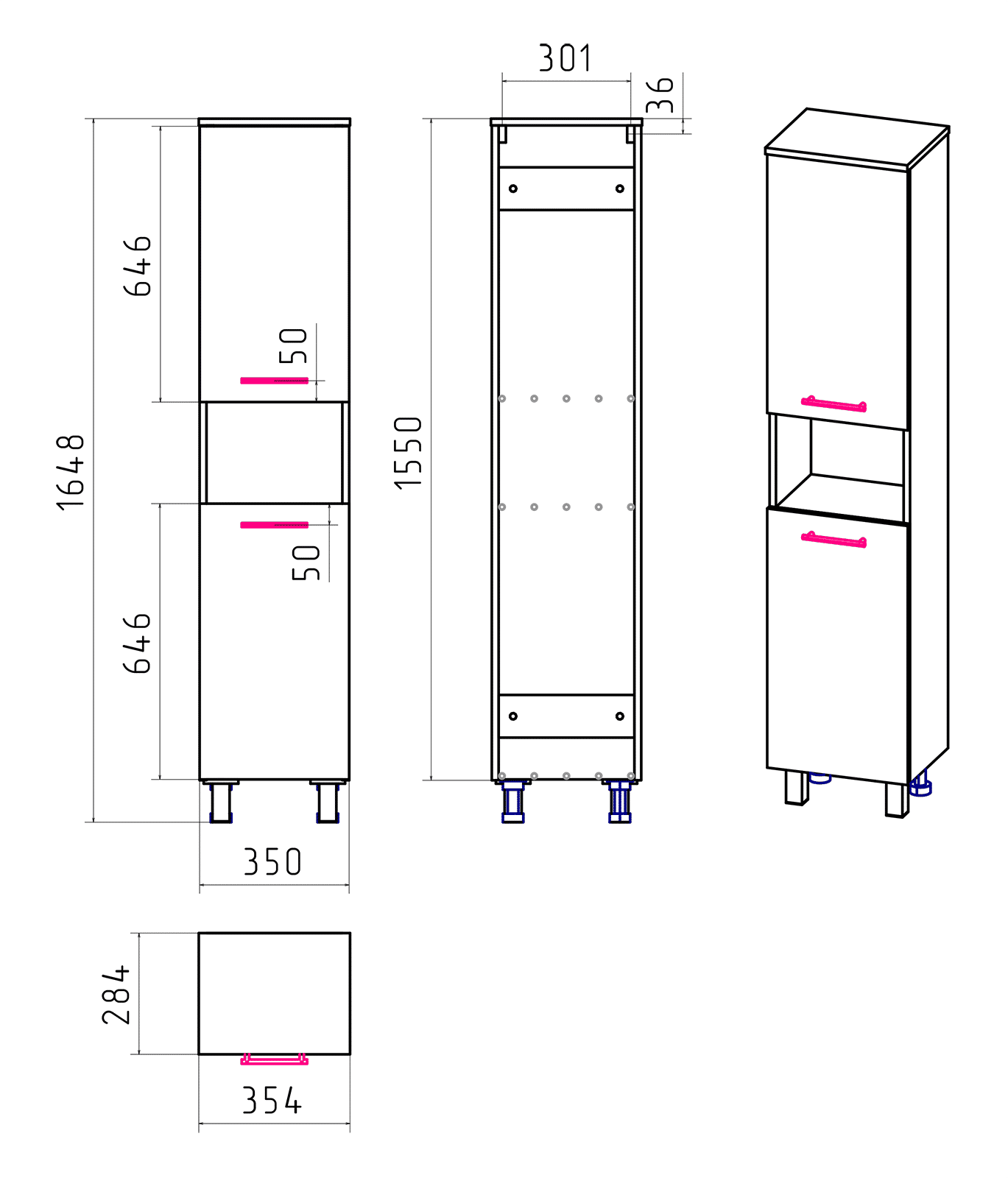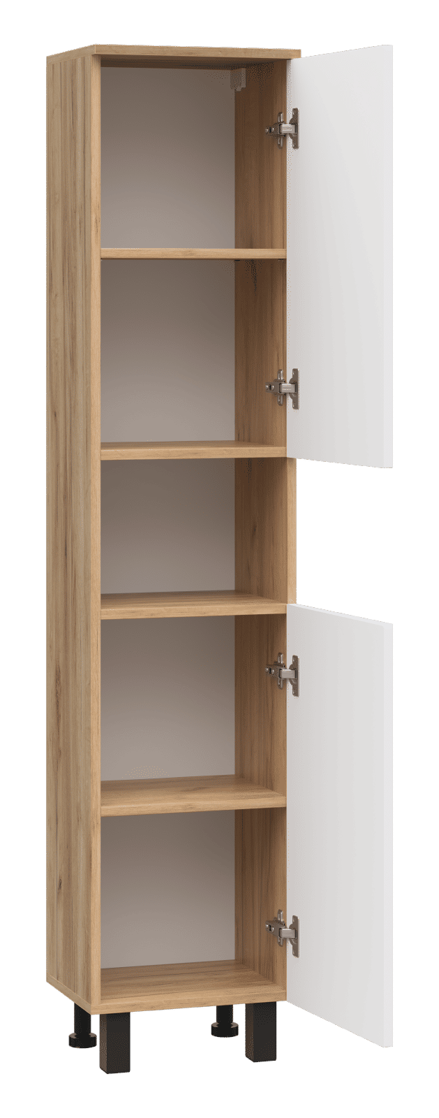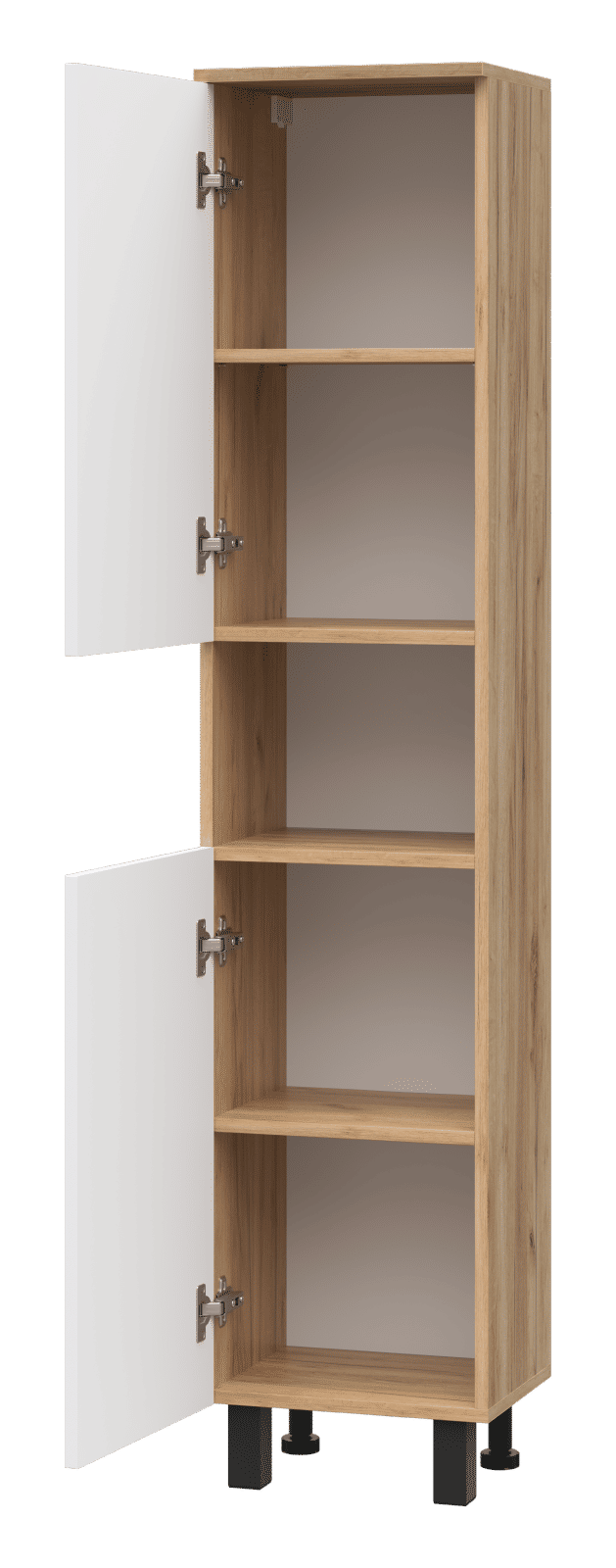 Пенал выполнен в одном исполнении с шириной 35 см. У шкафа есть два распашных фасада, между которыми находится открытая ниша. Дверцы могут открываться вправо и влево (в зависимости от установки петель).