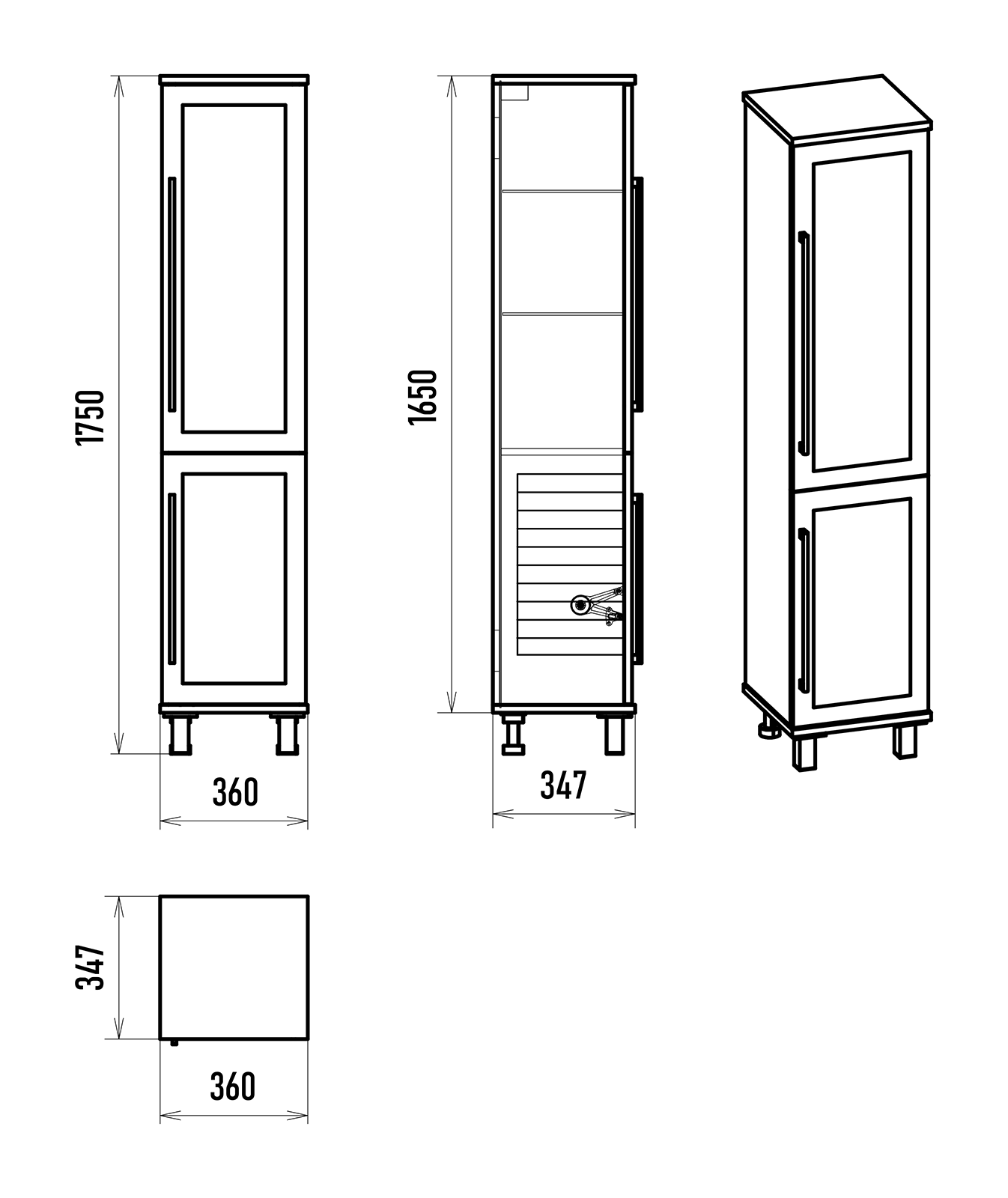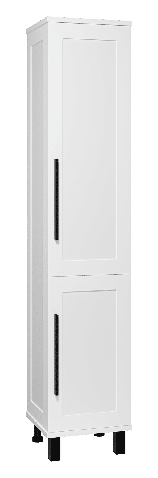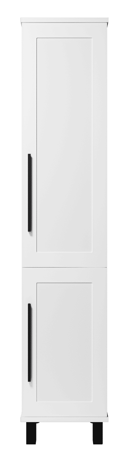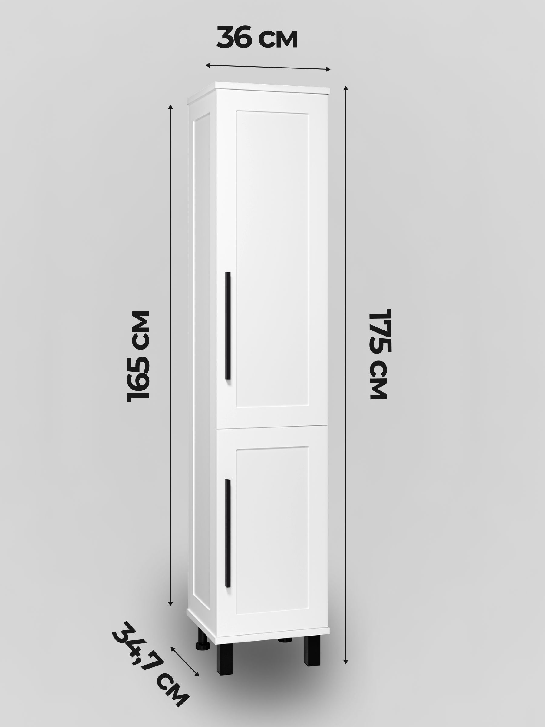 Шкаф также оборудован четырьмя регулируемыми опорами (две спереди и две сзади), что обеспечивает стабильность и возможность настройки под любой пол. Черные ручки придают шкафу современный и стильный вид, подчеркивая его элегантность.